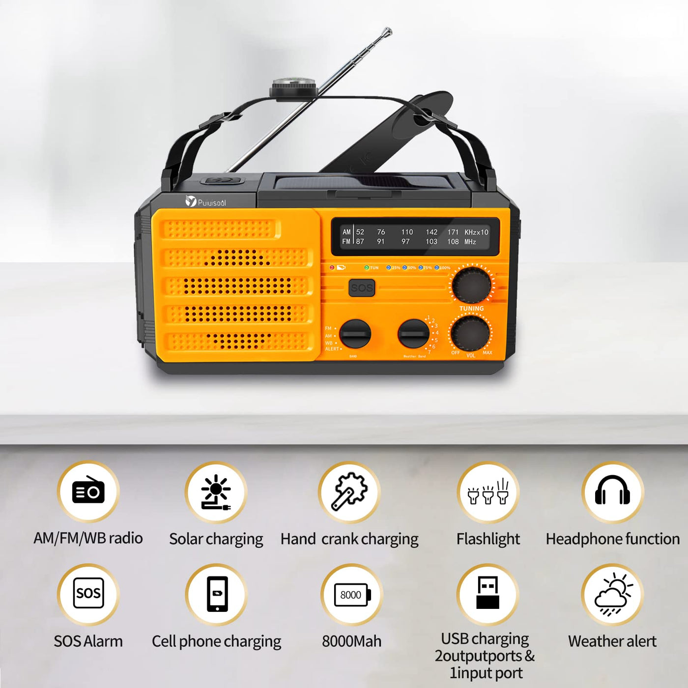 Emergency Radio,Puiuisoul 8000Mah Portable Weather Solar Radios With Hand Crank,Reading Lamp,3 Gear Led Flashlight,Sos Alarm,Am/