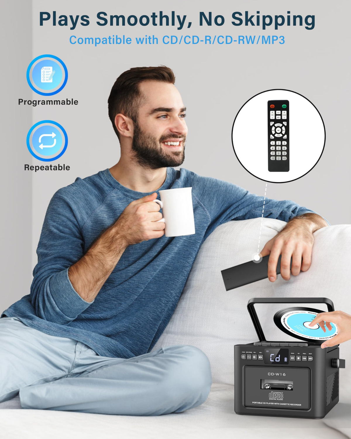 ?Compatible With Multiple Cd Formats?The Cd Player Portable Boombox Support Cd / Tape / Recording / Aux / Fm Radio / Bluetooth / Usb / Tf Playback In Multiple Modes. Widely Compatible With Cd, Cd-R, Cd-Rw, Mp3 And Wma. Supports Normal Playback, Single Cycle, Full Cycle,Random Play And A-B Repeat Modes. Programming Supported. ?Relive Old Memories And Play Classic Clips?The Boombox Cassette Tape Player Combo Has A Built-In Microphone For Tape Input. Our Boombox Cd Players For Home Can Record In Cd/Aux/Usb/Bluetooth/Radio Mode. Note: In Tape Mode Your Voice Cannot Be Recorded. ?Dual Full-Range Stereo Bluetooth Speakers?Bluetooth 5.1 Technology . Enjoy Soaring Highs And Deep Bass At Any Volume Level. Dual-Band Stereo Speakers Of The Boom Box Deliver More Volume For A Better Music Experience.Versatile Song Styles: Flat, Rock, Pop, Jazz And Classical! ?Fm Radio Portable With Best Reception?The Boombox Cd Player Is Equipped With A Retractable And 360 Rotating Transistorized Antenna That Ensures Excellent Reception. Am Fm Radio Frequency Range: Fm: 87.5-108Mhz. ?Durable & Premium Battery?The Cd Player Boombox Built-In Rechargeable Lithium-Ion Battery With Up To 5000Mah Capacity. New Universal Type-C Charging Head Allows For 5-8 Hours Of Continuous Uninterrupted Use After Charging. Visualization Of The Power Bar. ?Supports Multiple Input Methods?The Boom Box Cd Player Am Fm Radio Supports Aux, Usb Disk And Tf. ?Intelligent Sleep Companion?This Cd Boombox Is Equipped With A Sleep Timer That Allows You To Choose To Turn It Off Automatically After 10-120 Minutes. With Sound And Music, It Can Make Lunch Breaks And Nights Better For Office Workers, Helping Them Fall Asleep Quickly And Away From Distractions. ?Warranty?The Cd And Cassette Player Combo Is A Perfect Gift For Youngsters, Elders, Parents Or Friends. If You Have Any Problems Or Questions, We Will Provide Support At Any Time. We Promise 15 Days Refund, 12 Months Warranty And Lifetime Service Support. Packges Includes: Boombox With Cd And Cassette Player*1, Type-C Cord*1, Remote Control*1, User Manual*1.