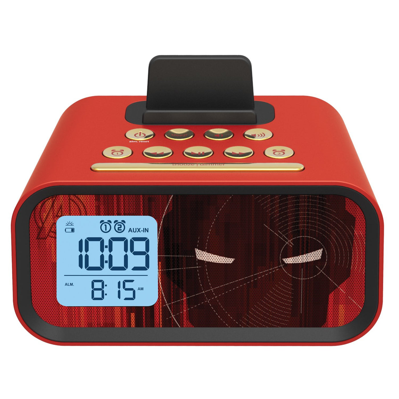 The Iron Man Dual Alarm Clock Speaker System Has A Usb Port For Charging Your Smartphone And A Convenient Stand That Supports Your Smartphone. With A Built-In Audio Cable That Plays Music From Any Device With A Headphone Jack. You Can Sleep To Your Music With Auto-Shutoff And Wake To A Buzzer With Dual Alarms. The Backlit Lcd Lets You See Time And Alarm Time Clearly.