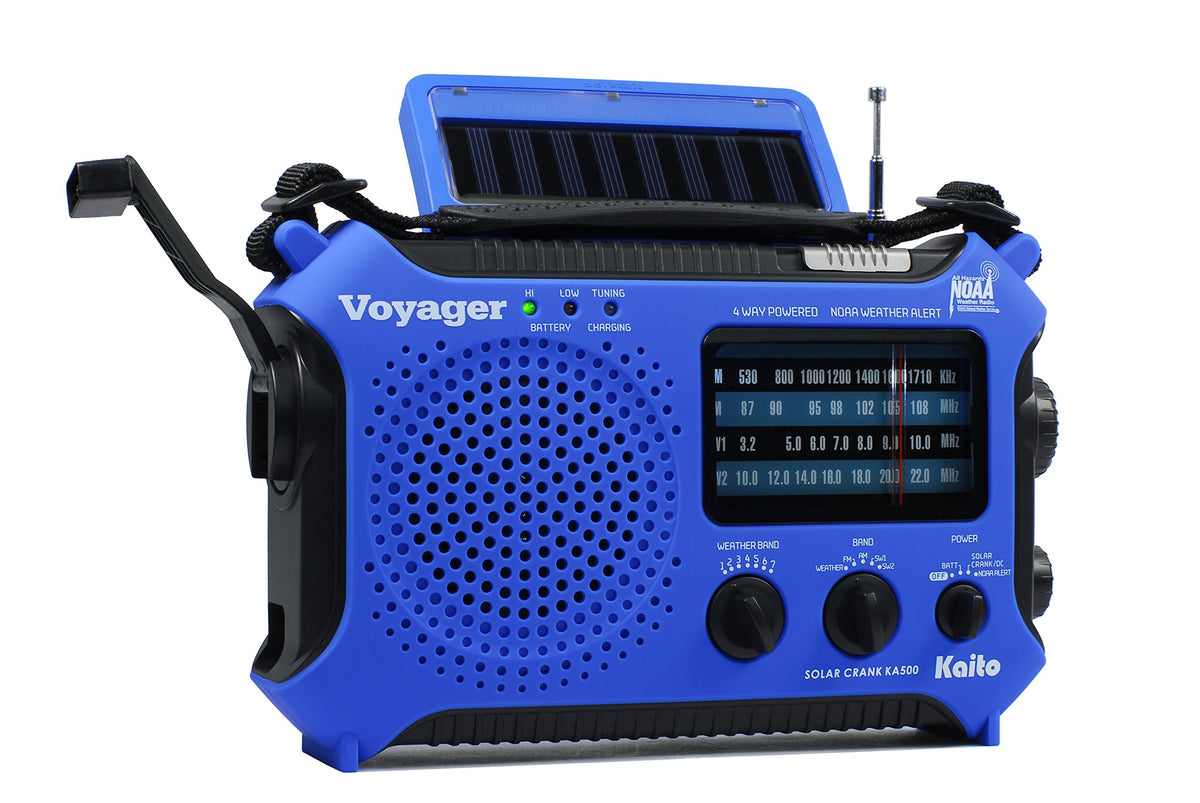 The Kaito Voyager Is The Perfect Radio For Emergencies And Disasters It Comes With A High Quality Ac Type Brushless Generator And The Solar Panel Powers The Radio By Itself And Charges The Built-In Batteries As Well To Maximize The Sunlights Rays, The Solar Panel Is Designed To Tilt With The Suns Position To Receive The Energy During The Day Time On The Bottom Side Of The Solar Panel Is A 5 Led Reading Lamp That You Can Use In Poorly Lit Conditions The Super Bright Led On The Side Can Be Used As A Flashlight Or Can Be A Red Flashing Emergency Signal The Radio Is Designed To Charge Many Small Electronic Items With Its Usb Jack That Can Connect To Many Standard Usb Enabled Gadgets Like Your Ipod Or Cellphone It Also Comes With 6 Cellphone Tips That Can Charge Many Model Phones By Cranking Or Solar Power The Weather Alert Feature Enables You To Receive The Alert Signal When A Disaster Arrives 5 Led Reading Lamp For Camping And Emergency Use White Led Flashlight Red Led Blinking For Emergency Alert Am - 520-1717 Khz Fm - 8800- 10800 Mhz Sw1 - 320-900Khz Sw2 - 900- 2200Khz Weather Band - 7 Standard Bands For All Stations, Pll Crystal Control Circuit For Stable Reception Weather Alert - To Be Activated By Weather Alert Signals
