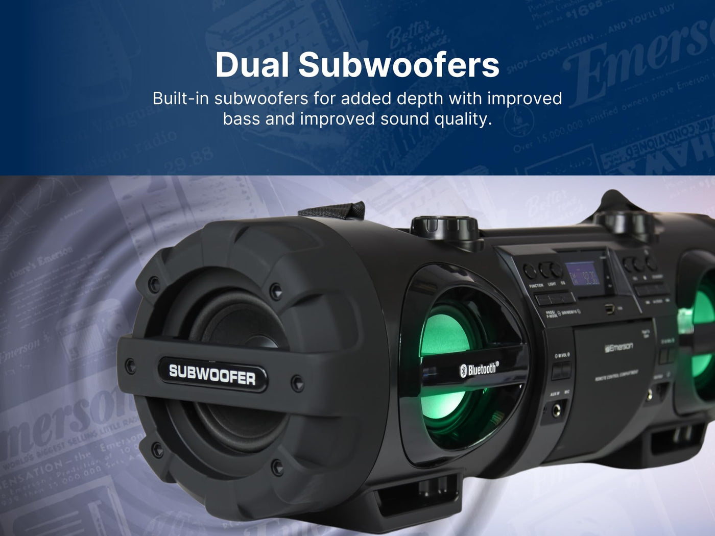 Q: What makes the Emerson EPB-3001 different from other boomboxes?A: The Emerson EPB-3001 stands out due to its dual subwoofers that provide rich bass, high-quality 20W RMS speakers for clear sound, and its multifunctionality as both a CD player and a Bluetooth speaker. Its portability, combined with AC and battery power options, makes it incredibly versatile for various listening environments.