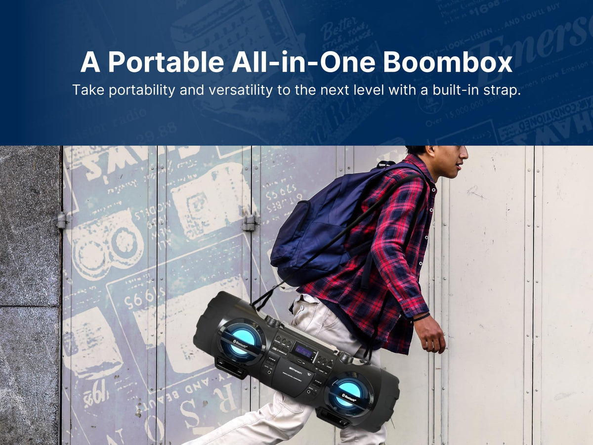 Q: Is the boombox portable for outdoor use?A: Absolutely! The Emerson EPB-3001 features a compact design with a sturdy carry handle, making it easy to transport for outdoor events. It can be powered by an AC adapter or 6 C batteries (not included) for true portability.
