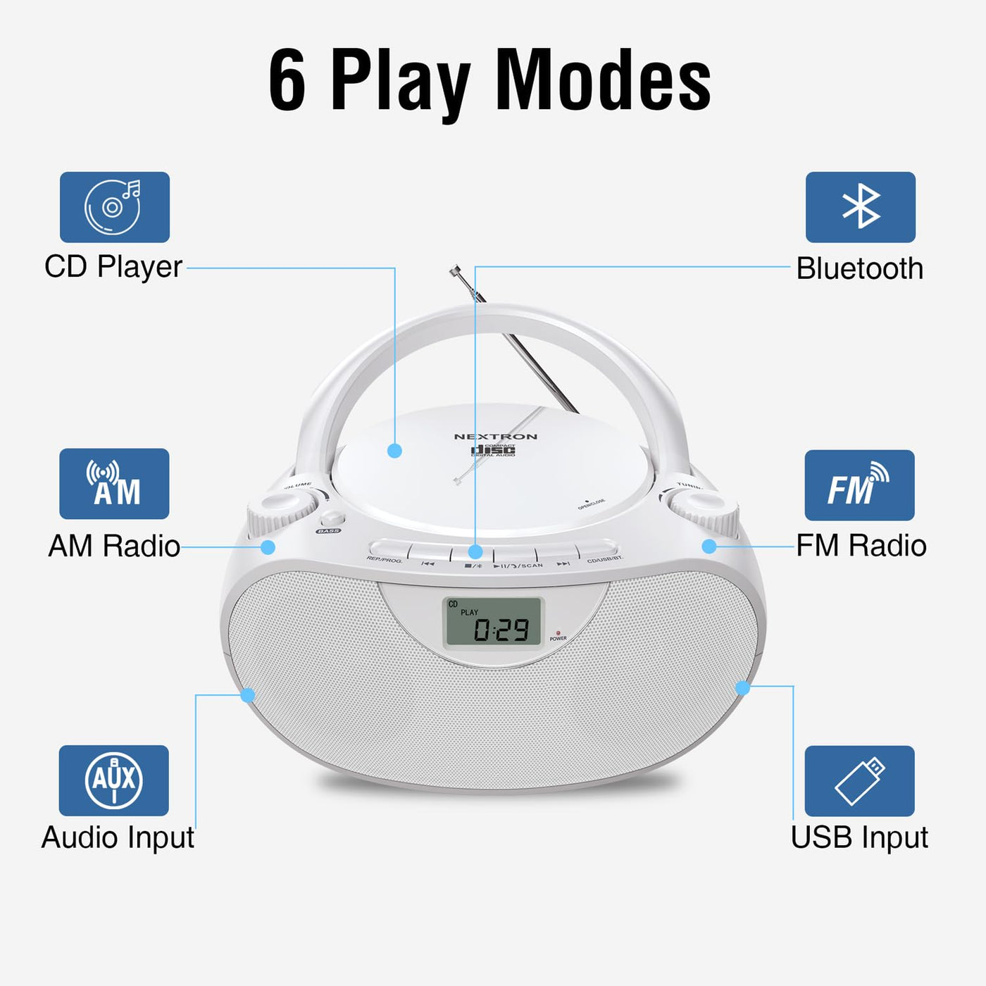 The Nextron Cb-500Bt Cd Player Portable Boombox Radio With Bluetooth Allows You Wirelessly Stream Music From Your External Bluetooth Devices. The Nextron Cd Boom Box Radio With Cd Player Combo Allows You To Use The Built-In Digital Am/Fm Tuner With 30 Presets To Easily Listen To And Save Your Favorite Stations, With Best Reception. A Top-Loading Portable Cd Player For Home Small Of This Cd Boombox Radio Player Enables You To Playback Cds, Cd-R/Rw And Mp3 Cds. The Usb Player With Speakers Plays Mp3 Or Wma Music Files From Your Usb Memory Devices Up To 128 Gb. The Portable Cd Player With Speakers Deliver Powerful, Clear And Well-Balanced Audio With Bass Boost Function. The Auxiliary Input (Type 3. 5Mm) Allows You To Enjoy Wired Music. This Boombox Cd Player Portable Also Features Full Screen Lcd Display, Big Volume Dial And Fm Dial, Extra Bass Boost Button, Ac/Battery Powered, And More. With The Durable And Portable Design, This Little Multi-Functional Portable Stereo Cd Radio Player With Bluetooth Is A Perfect Option For Your Music Listening Experience, Whether At Home Or On The Go.