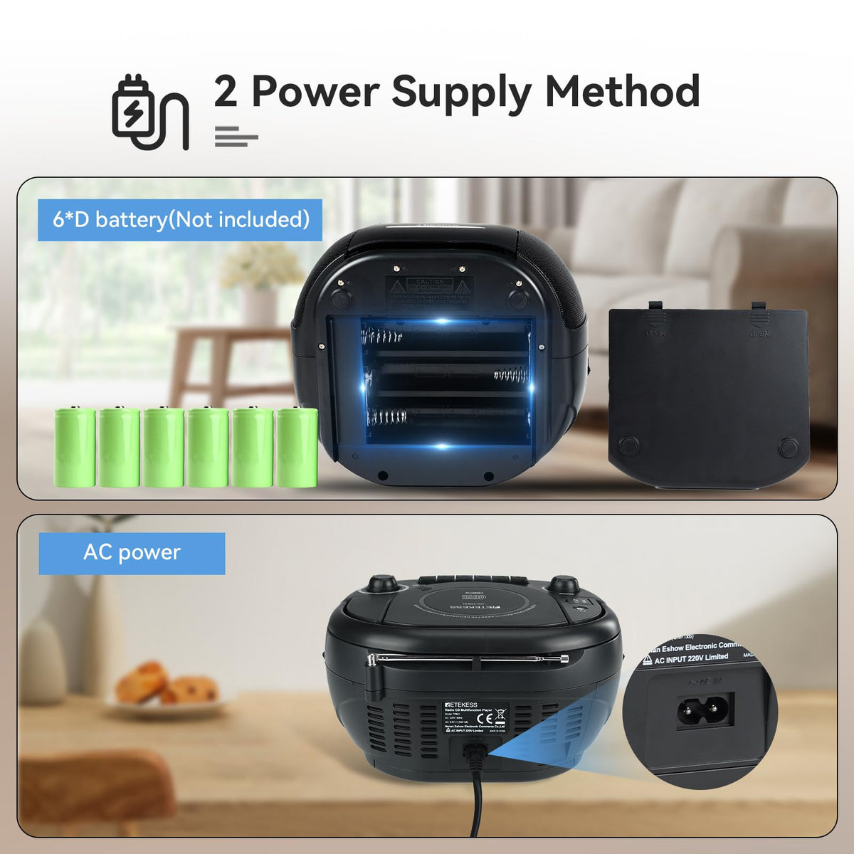 Q: What are the power options for the Retekess TR621?A: The Retekess TR621 can be powered in two ways: it can be plugged into an AC power source (110V, 60Hz) or operated using 6 D-size batteries, making it suitable for both home and outdoor use.