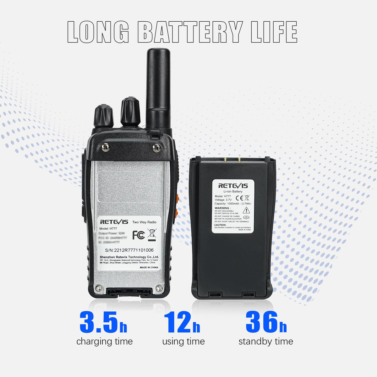 The Updated 3.0 Version Of H-777 Has A More Compact Body And A Shorter Antenna Design; You Can Easily Put It In Your Pocket Or Wear It On Your Belt | Easy To Use; You Can Talk Directly With Rt22 Walkie-Talkie Out Of The Box; There Are No Complicated Buttons; Which Is Convenient For Employees Or Teams To Get Started Quickly | Rugged Walkie-Talkie;The Body Can Withstand Shock And Vibration In Harsh Environments; The Short Antenna Design Is Very Sturdy; You Do Not Have To Worry About Falling Off | 1000Mah Battery Capacity Supports 10-12 Hours Continuous Use Or Longer; Durable Battery Latch Teeth Maintain Solid Contact To Promise Your Continuously Communication | Multifunctional Commercial 2 Way Radios; Hands-Free; Emergency Alarm; Squelch; Led Flashlight; Power Saving; Low Battery Reminder | Our Walkie Talkies Is Only Frs Walkie Talkies; The Fcc Id Is 2Aar8H777;Our Walkie Talkies Meet Fcc Rule Part 95;Please Buy With Confidence