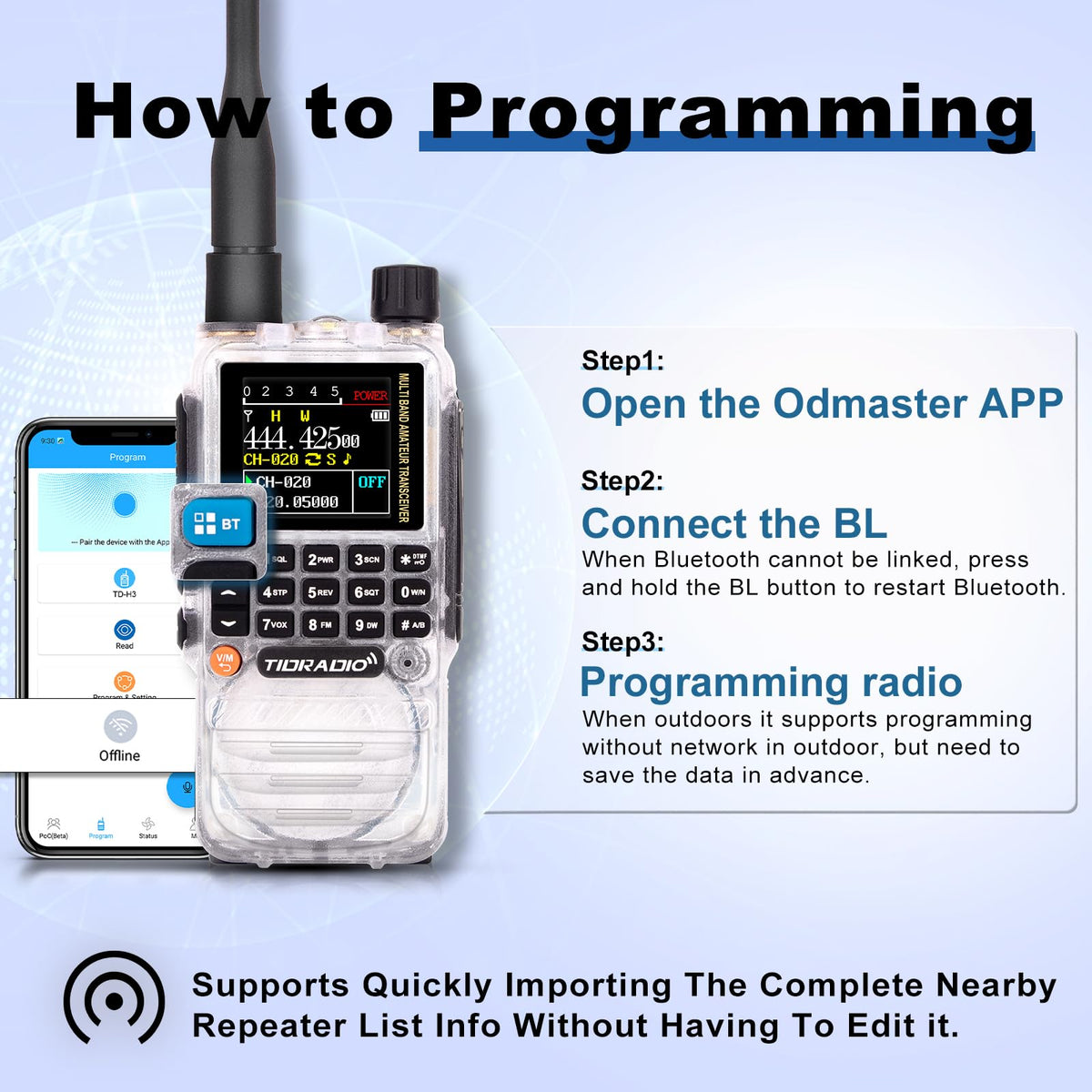 The Tidradio Td-H3 Is A Pair Of Gmrs Radio Designed For Gmrs Operators Who Enjoy Hunting Or The Outdoors And Need Long Range Communication Capabilities In An Emergency Situation.The Td-H3'S Bluetooth Programming Feature Allows Your Two-Way Radio To Connect To A List Of Nearby Repeater List Without Having To Rely On A Computer To Program It , It'S Easily Programmed Using Only Your Phone.