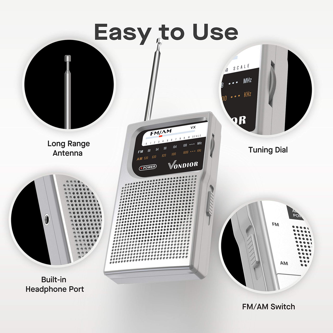 Vondior Am/Fm Battery Operated Portable Pocket Radio Best Reception And Longest Lasting. Am Fm Compact Transistor Radios Playe