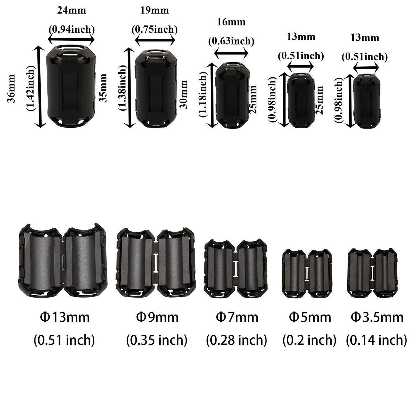 Product Name: Ferrite Cores Ring Clip-On Rfi Emi Noise Suppression Filter Cable Clip Color:Black Size : 0.14 Inch/ 3.5 Mm (Inner Diameter): About 0.98 X 0.51 Inch/ 25 Mm X 13 Mm (Outer Size) 0.20 Inch/ 5 Mm: About 0.98 X 0.51 Inch/ 25 Mm X 13 Mm 0.28 Inch/ 7 Mm: About 1.18 X 0.63 Inch/ 30 Mm X 16 Mm 0.35 Inch/ 9 Mm: About 1.38 X 0.75 Inch/ 35 Mm X 19 Mm 0.51 Inch/ 13 Mm: About 1.42 X 0.94 Inch/ 36 Mm X 24 Mm Specification: 3.5Mm Inner Diameter: Suitable For 3.5-4.5Mm Cables; 5Mm Inner Diameter: Suitable For 5.0-6.5Mm Cables; 7Mm Inner Diameter: Suitable For 7.0-8.5Mm Cables; 9Mm Inner Diameter: Suitable For 9Mm Cables; 13Mm Inner Diameter: Suitable For 10.5-12.5Mm Cables; Packing Included: 15 Pcs-9Mm Inner Diameter