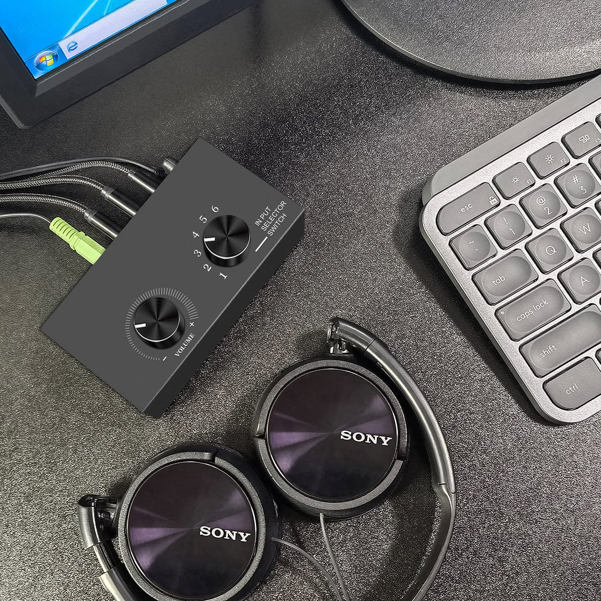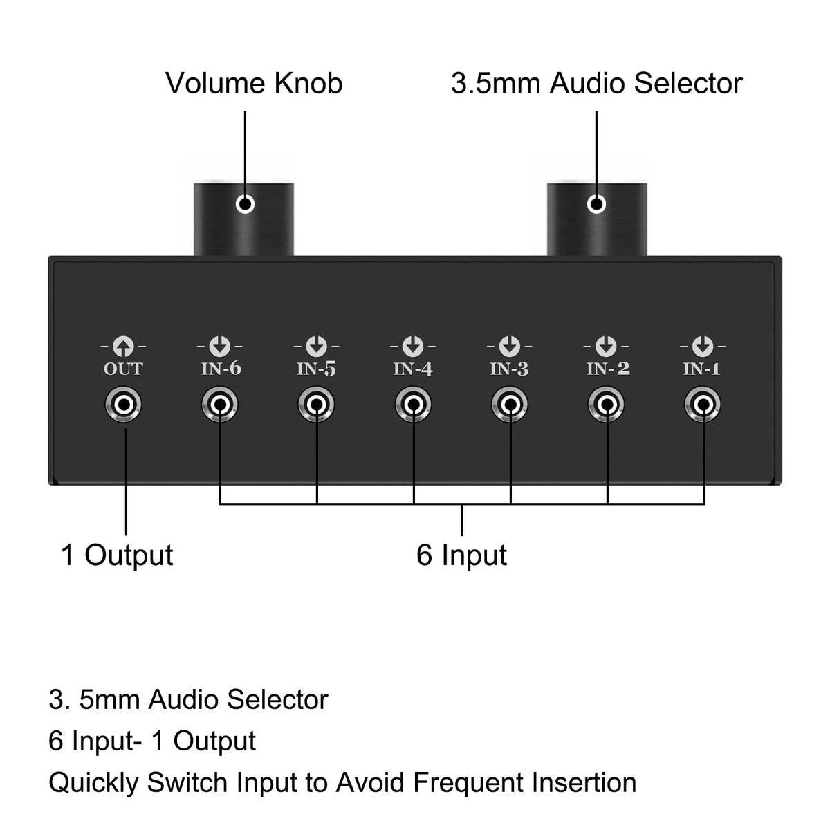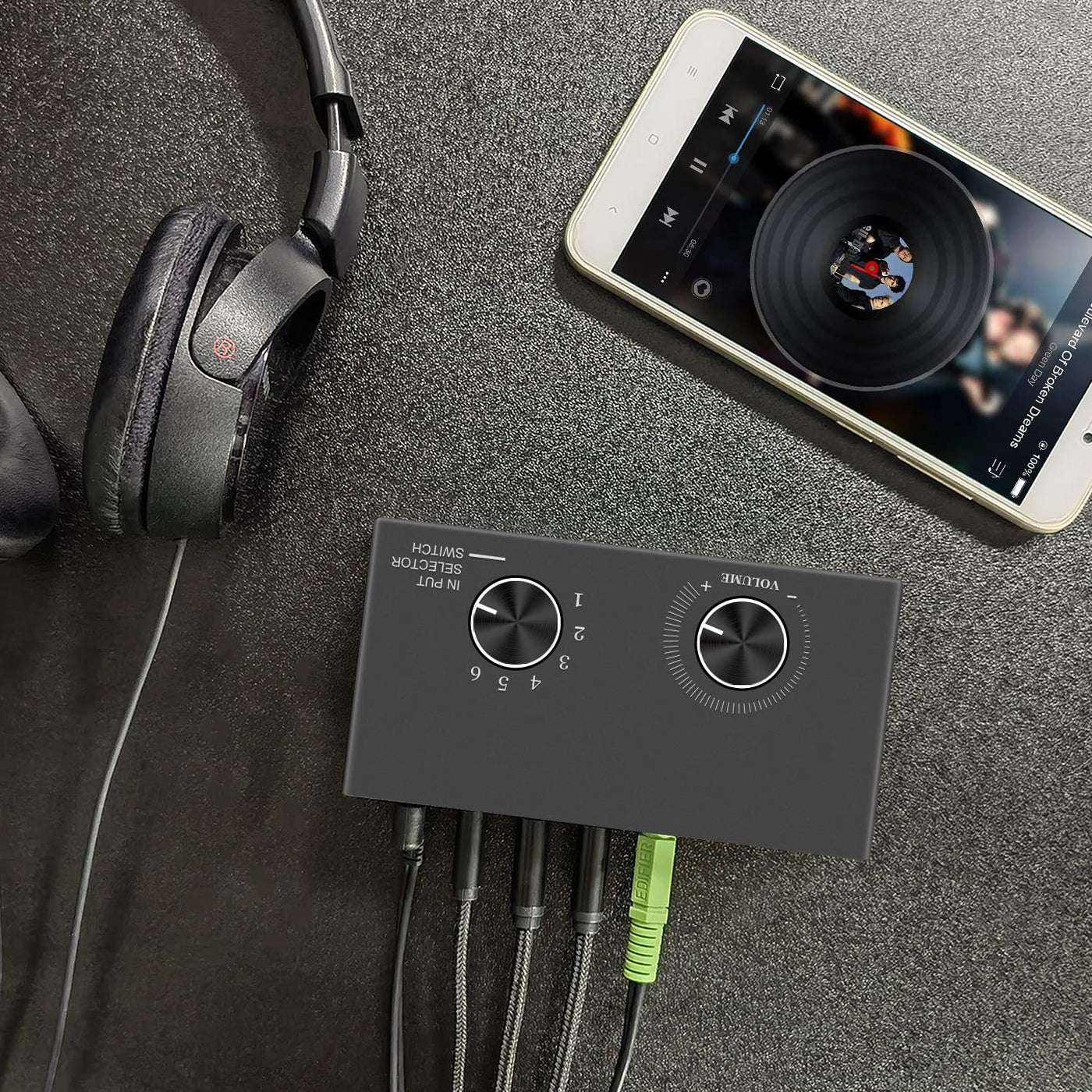 6-Channel 3.5Mm Audio Switcher Box Lvy Audio Switch Box Is Designed For Audio Enthusiasts With Multiple Audio Systems. 6 Input-1 Output Audio Switching, You Can Connect Different Audio Devices To The Switch Box, And Then Quickly Switch The Audio Input Signal By Switching The Knob To Make You Unnecessary Insertion Between Trivial Devices. Mini Design Is Very Suitable For Desktop Audio Systems, And Your Space Will Not Take Up Audio Switch With A Sound Knob Switch To Easily Control The Volume Metal Appearance, Sturdy And Durable, Non -Destructive Sound Quality Simple Use Method, No Driver And Additional Power Supply, Just Insert And Play 6 Input - 1 Output Audio Selector Please Note: The Adapter Does Not Support Microphone Input. Audio Switcher 6-Channel 3.5Mm Audio Switcher Aux Selector Box 6-Channel 3.5Mm Audio Switcher, Passive Stereo 1/8� Aux Selector Box For Speaker/ Headphones/ Laptop/ Computer/ Smartphone And Ps4/Ps5 Gaming System Ect.