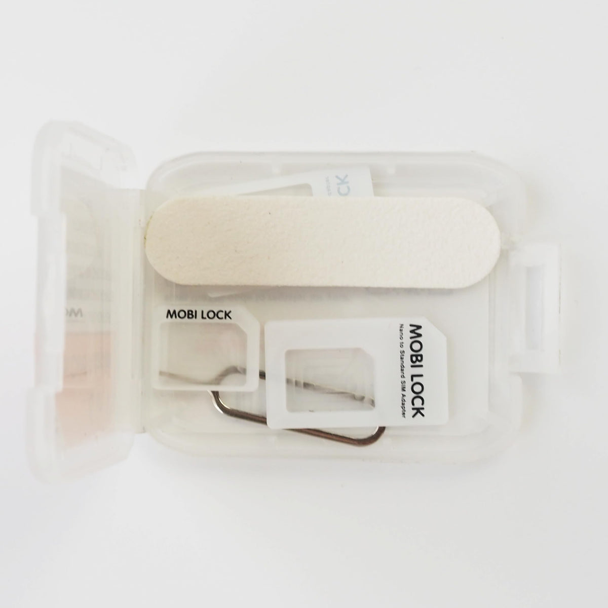 Q: What comes included in the Mobi Lock Sim Card Adapter Kit?A: The Mobi Lock 6 in 1 Sim Card Adapter Kit includes one Nano to Micro Sim Card Adapter, one Nano to Standard Sim Card Adapter, one Micro to Standard Sim Card Adapter, a SIM ejector tool, a nail file, and a plastic storage pouch for easy organization.
