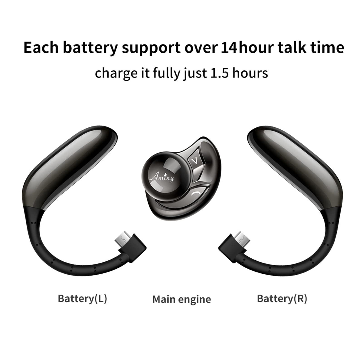 Q: How long does the battery last on the AMINY Bluetooth Earpiece?A: Each battery of the AMINY Bluetooth Earpiece supports up to 14 hours of talk time and takes approximately 1 to 2 hours to fully recharge, making it ideal for long usage periods.