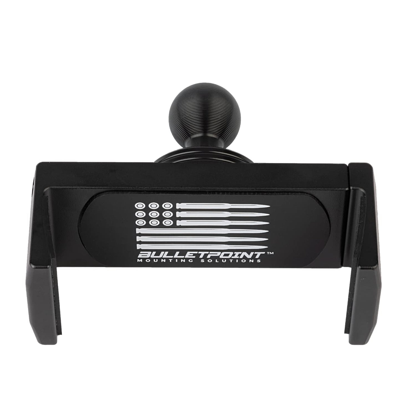 Q: What phones are compatible with the Bulletpoint XL Dash Mount Cell Phone Holder?A: The Bulletpoint XL Dash Mount Cell Phone Holder is designed to accommodate oversized phones that measure between 3.3 and 4 inches in overall width with the case installed. It is compatible with various iPhone and Android smartphones.