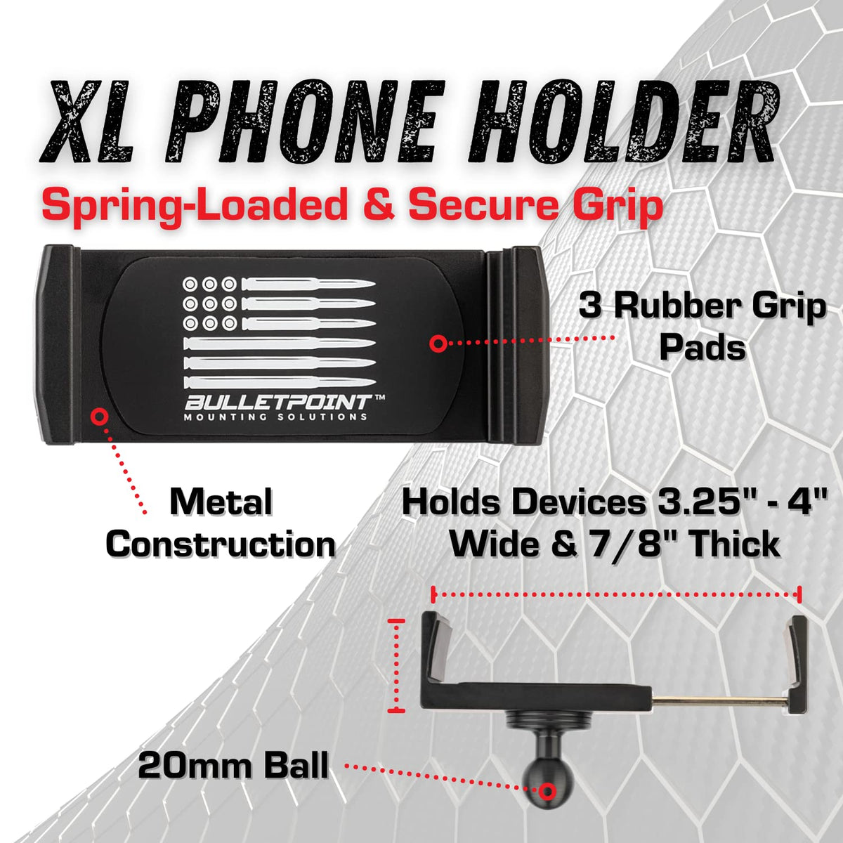 Important Sizing Note: This Xl Phone Holder Is Designed For Phones That Measure Between 33 And 4 Inches In Overall Width With The Case Installed Our Standard Universal Phone Holder Is Often The Best Choice Even For Larger Phones Such As The Pro Max Models With A Basic Case Measure Your Phone Setup Prior To Ordering And Refer To The Included Sizing Image High Quality Metal Construction You Wont Find Any Plastic Here Our Spring-Loaded Xl Phone Holder Is Made From High Strength Aluminum And Features 3 Rubberized Grips On The Inner Surface Providing A Secure Grip On Your Phone Rock Solid Grip On Your Phone Bumpy Terrain Potholes Off-Roading No Matter The Road Conditions, Our Xl Universal Phone Holder Will Keep Your Oversized Phone In Place Thanks To The Spring-Loaded Mechanism And 3 Rubber Grips Single-Handed Operation Once Attached, Our Phone Holder Only Requires One Hand To Operate 20Mm System On The Back Side Of Our Phone Holder Is An Integrated 20Mm (0787 Inches) Mounting Ball Which Attaches Seamlessly To Any Of Our Standard Mounting Arms Opens Up To 4 Inches Wide Our Xl Universal Phone Holder Is Specifically Compatible With Oversized Iphone And Android Phones Accommodating A Range Of Phone Sizes From 325 To 4 Inches Wide And Up To 78 Inches Deep Standard Universal Or Xl Universal Trying To Choose Between Our Standard Universal And Xl Universal Phone Holders Be Sure To Reference Our Comparison And Dimension Images Which Provide All The Width And Depth Measurements Measure The Overall Width And Depth Of Your Phone With The Case Installed