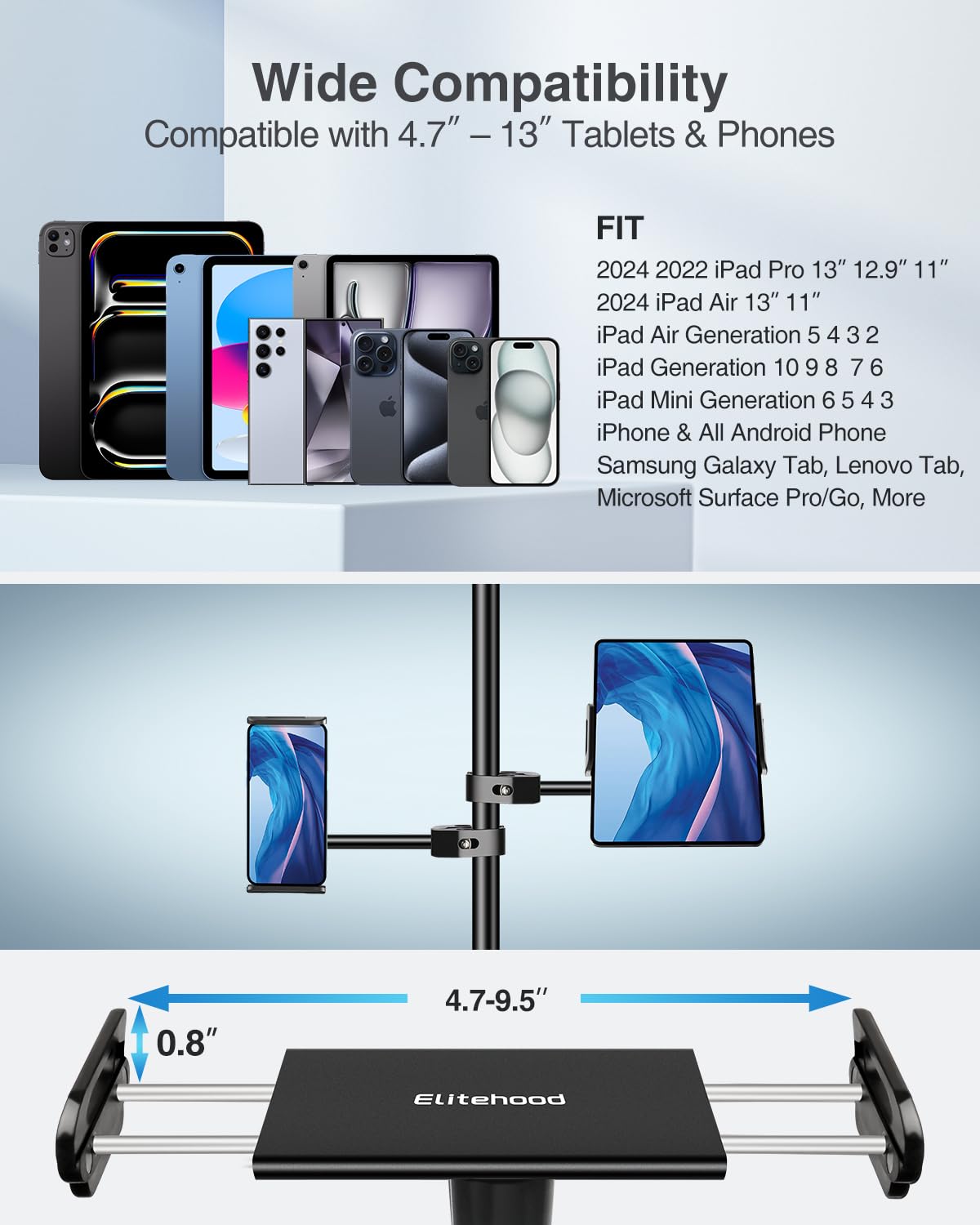 Q: What devices are compatible with the elitehood Aluminum iPad Holder?A: The elitehood Aluminum iPad Holder is compatible with devices ranging from 4.7 to 13 inches, including various models of iPads such as iPad Pro (up to 13 inches), iPad Air, iPad Mini, and smartphones like iPhone 13 Pro and Galaxy Note.