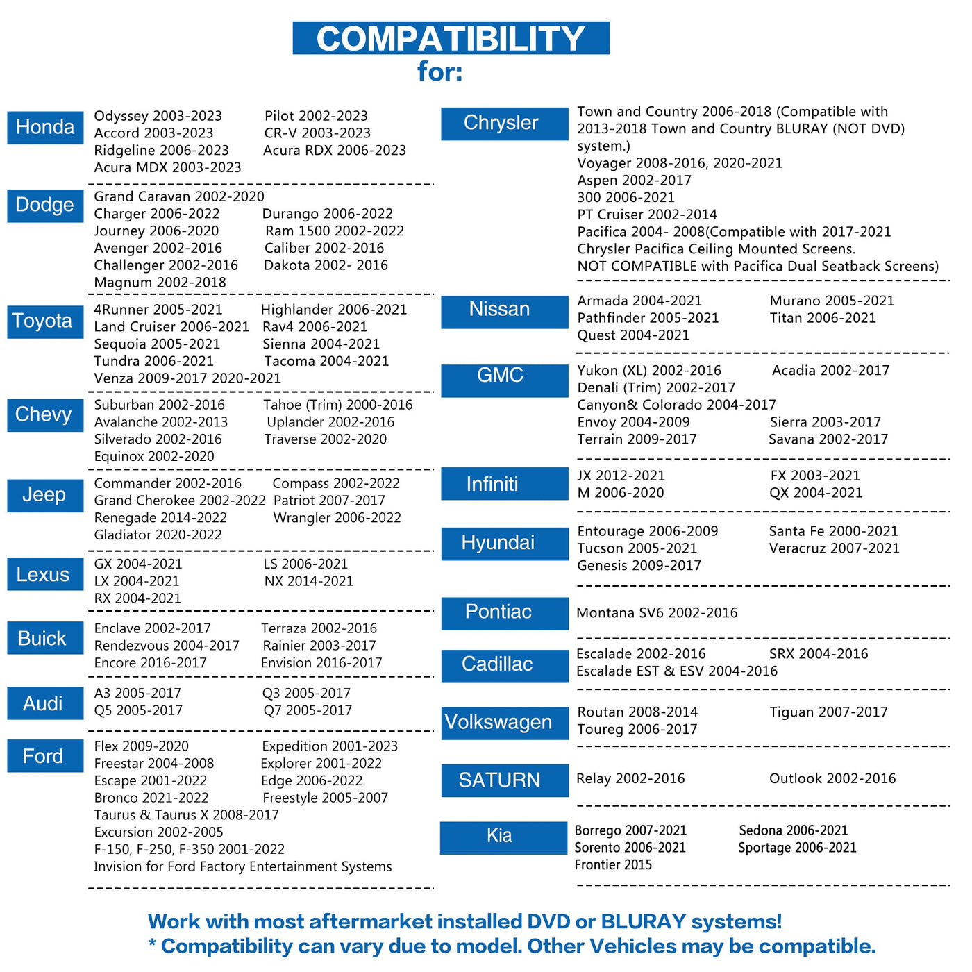 These Infrared (Ir) Headphones Work Wirelessly With Most Overhead & Headrest Monitors That Have A Built-In Infrared (Ir) Transmitter. Some Popular Vehicles' Compatibility Is As Below.Chrysler Town & Country 2006 2007 2008 2009 2010 2011 2012 2013 2014 2015 2016 2017 2018 (Compatible With 2013-2018 Town And Country Bluray(Not Dvd) Systemtoyota Sienna 2004 2005 2006 2007 2008 2009 2010 2011 2012 2013 2014 2015 2016 2017 2018 2019 2020 2021Toyota Sequoia 2005 2006 2007 2008 2009 2010 2011 2012 2013 2014 2015 2016 2017 2018 2019 2020 2021Honda Odyssey 2003 2004 2005 2006 2007 2008 2009 2010 2011 2012 2013 2014 2015 2016 2017 2018 2019 2020 2021 2022 2023Dodge Grand Caravan 2002 2003 2004 2005 2006 2007 2008 2009 2010 2011 2012 2013 2014 2015 2016 2017 2018 2019 2020 Dodge Durango 2006 2007 2008 2009 2010 2011 2012 2013 2014 2015 2016 2017 2018 2019 2020 2021 2022Chevy Tahoe (Trim) 2000 2001 2002 2003 2004 2005 2006 2007 2008 2009 2010 2011 2012 2013 2014 2015 2016 Chevy Suburban 2002 2003 2004 2005 2006 2007 2008 2009 2010 2011 2012 2013 2014 2015 2016Gmc Yukon (Xl) 2002 2003 2004 2005 2006 2007 2008 2009 2010 2011 2012 2013 2014 2015 2016Gmc Acadia 2002 2003 2004 2005 2006 2007 2008 2009 2010 2011 2012 2013 2014 2015 2016 2017Cadillac Escalade 2002 2003 2004 2005 2006 2007 2008 2009 2010 2011 2012 2013 2014 2015 2016Nissan Pathfinder 2005 2006 2007 2008 2009 2010 2011 2012 2013 2014 2015 2016 2017 2018 2019 2020 2021Buick Enclave 2002 2003 2004 2005 2006 2007 2008 2009 2010 2011 2012 2013 2014 2015 2016 2017These Headphones Are Designed With Kids In Mind: Easy To Wear, Easy To Use, No Pairing Or Complicated Settings Required! Just Insert The Batteries And Listen To Crystal Clear Sound. Users Can Directly Control The Volume Of Music And Movies Through The Controls On The Ear Cup. Premium Sound, Soft, Lightweight, Fit Comfortable On Little One'S Head. Perfect For Long Road Trips Which Can Not Only Entertain Kids, But Also Leave The Parents With Peaceful Space.