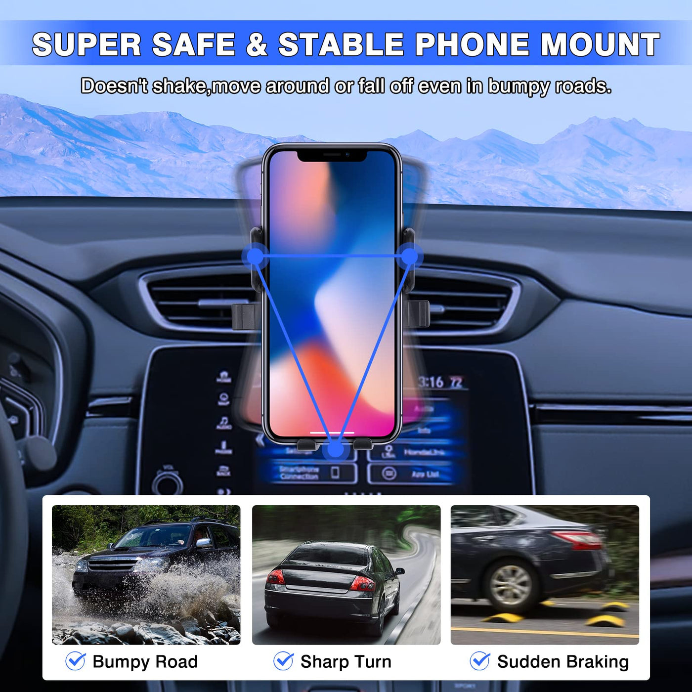 Q: Will the holder stay secure during bumpy rides or sharp turns?A: Absolutely! The Karltys Car Phone Holder is designed with a stable mechanical structure, ensuring it holds your phone securely in place without shaking, moving, or falling off, even during bumpy rides or sharp turns.