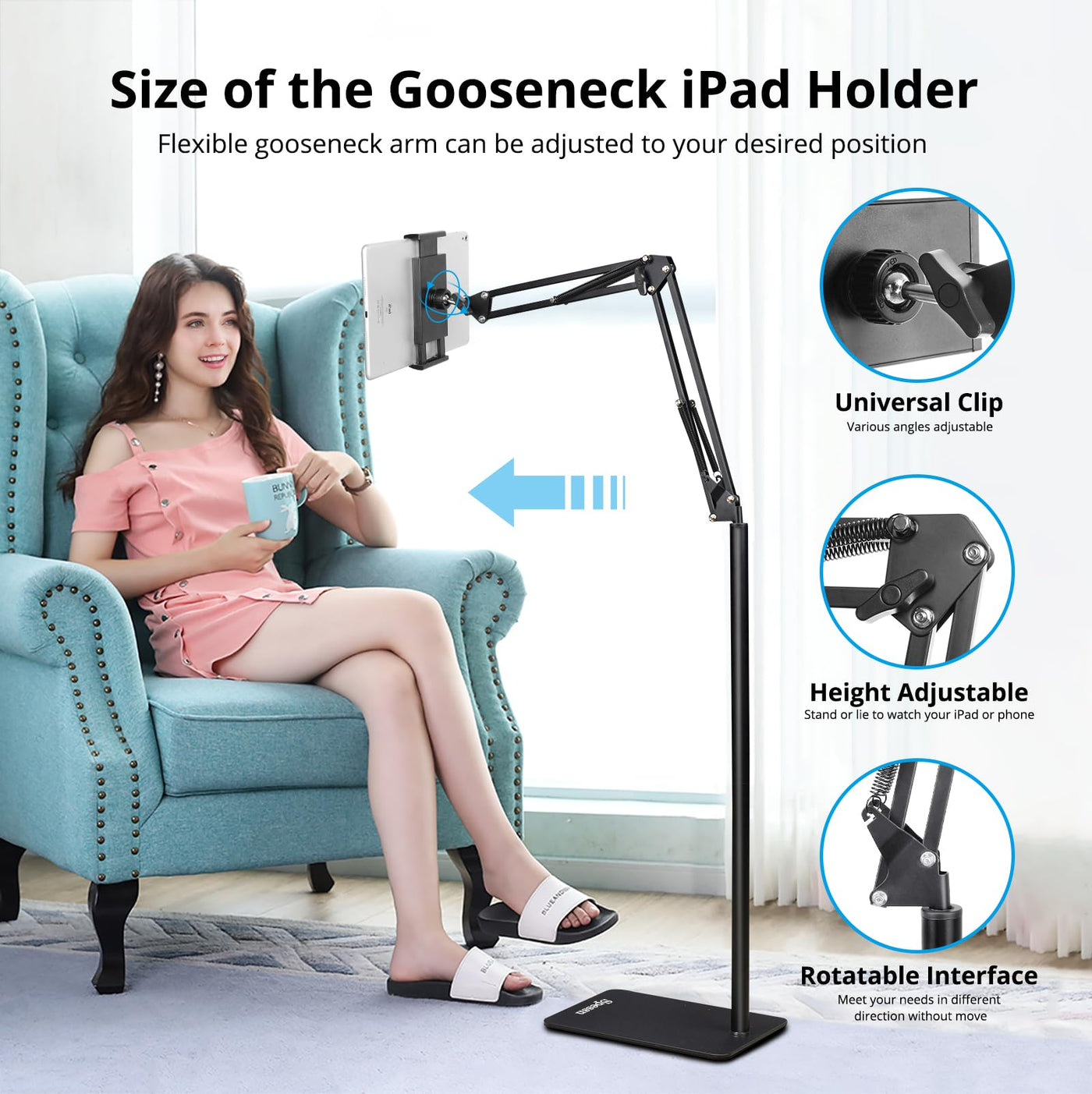 Q: What devices are compatible with the Spessn Adjustable Tablet Floor Stand?A: The Spessn Adjustable Tablet Floor Stand is designed to hold tablets and phones that are between 3.5 to 10.6 inches in size. It is compatible with a variety of devices, including Apple iPad Air, iPad mini, iPad Pro, Samsung Tab, and iPhone models such as 6, 6s, 7, and Plus. However, it is not suitable for the iPad Pro 12.9-inch model.