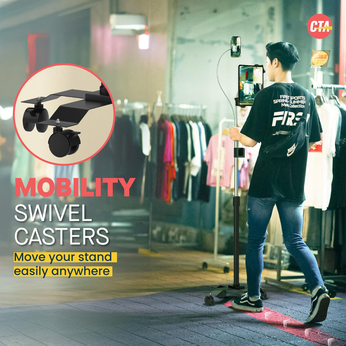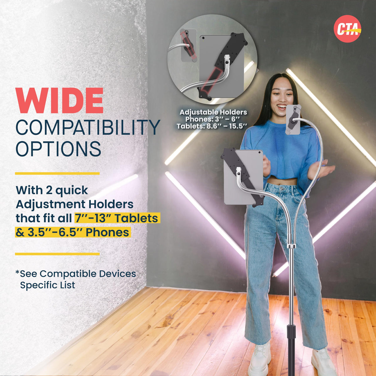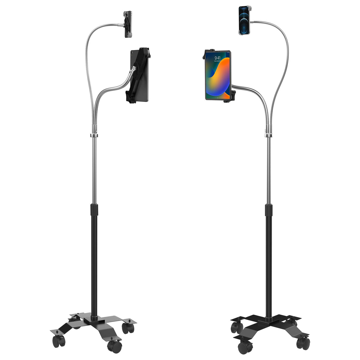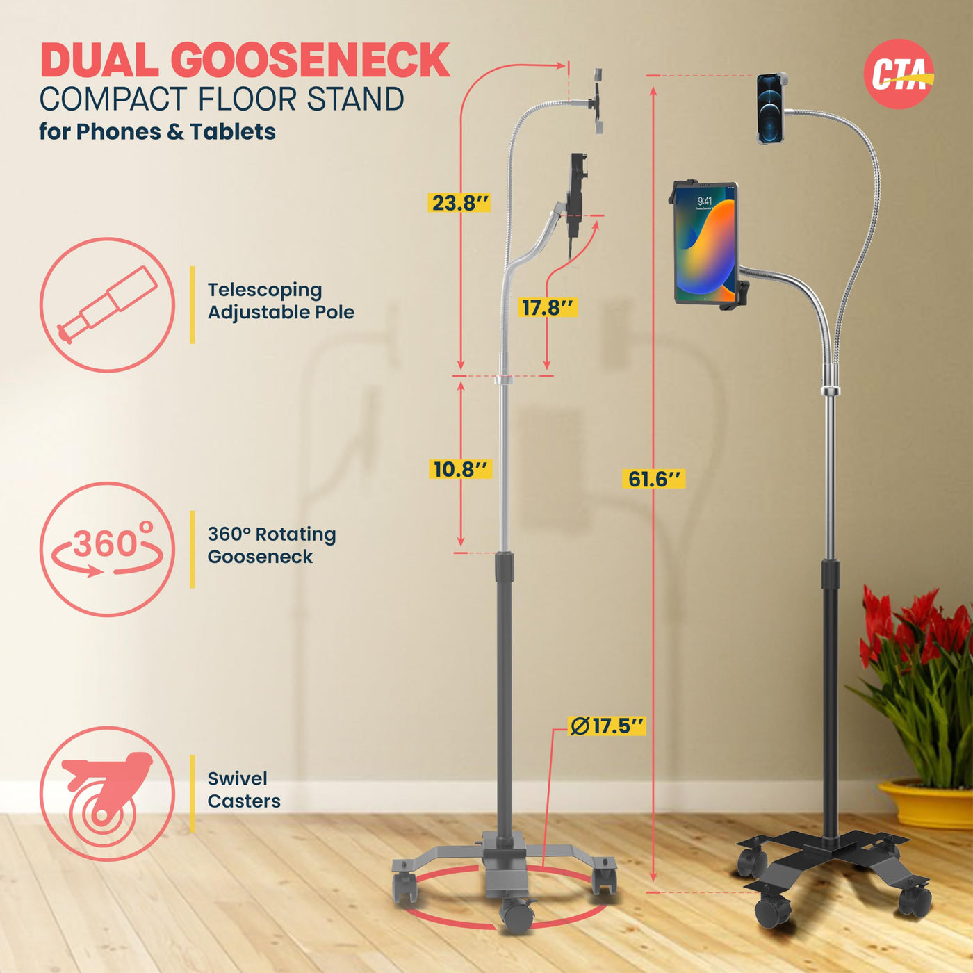 Cta Digitals Compact Dual Gooseneck Floor Stand Creates An Instant Content Creation Station, Presentation Tool, And Hands-Free Adjustable Workstation. This Stand Is Equal In Adjustability, Featuring 2 Powerful, Flexible Goosenecks With Tilting Headpieces For Easy 360-Degree Rotation. The First Generous, 35-Inch Gooseneck Comes Complete With A Universal Cell Phone Holder. It Safely Cradles Any Phone From 3.5-6-Inches High (And Can Accommodate Most Phone Cases). The Second Gooseneck Holds Almost Any 7-13-Inch Tablet. The Quick-Adjusting Tablet Holder Slides Open And Secures Your 7-13-Inch Tablet By The Corners, Leaving Ports And Buttons Fully Accessible. Further Customize Your Workstation With The Stands Height-Adjusting, Telescoping Pole And Attachable Storage Cradle, Perfect For An External Battery Pack Or A Stack Of Business Cards. The Included Swivel Casters Attach Effortlessly To The Stand Base, Giving Your Stand Easy Mobility In Your Office, Living Room, Classroom, Retail Space, Or Even On Your Exercise Bike Or Treadmill.