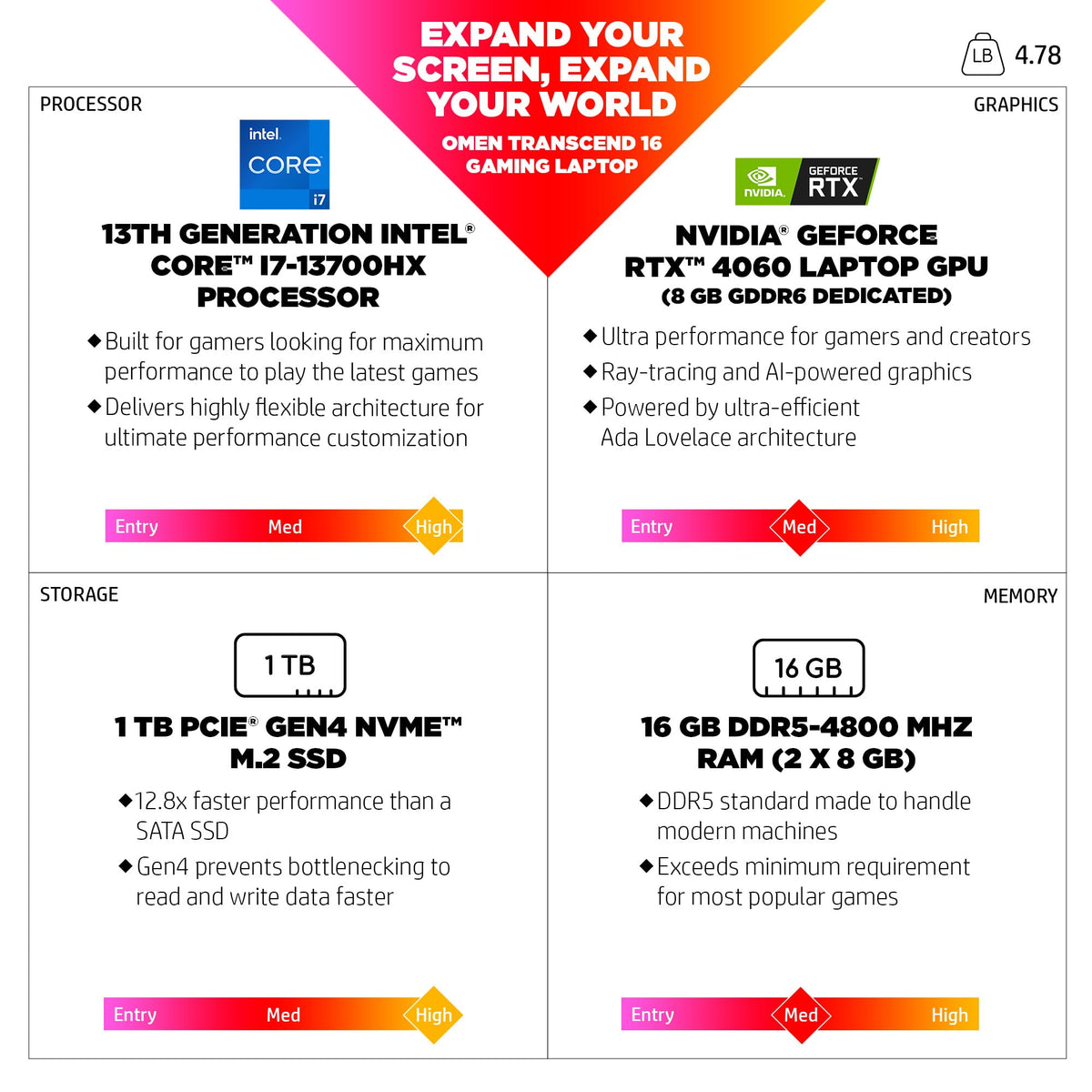 Omen By Hp Transcend Core I7-13700Hx Dsc Rtx 4060 8Gb 16Gb Ddr5 16.0'' Wuxga Lbl 400 Nit (165Hz) Non-Touch 1Tb Ssd 802.11Ax 2X2 Bt (6E) Fhd Ir Webcam No Dual Array Digital Mics 4-Zone Backlit Bang & Olufsen Batt 4 Cell C Long Life 70Whr Fstcrg Win11 Home 1 Year Shadow Black