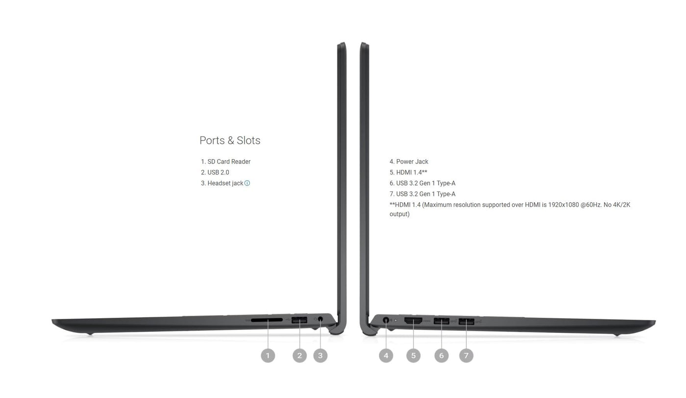 Tech Specs Processor: 12Th Gen Intel Core I7-1255U 1.7 Ghz (12 Mb Cache, 10 Cores, 12 Threads, Up To 4.70 Ghz Turbo With Intel Turbo Boost Technology) Operating System: Windows 11 Pro, English Graphics Card: Intel Iris Xe Graphics Display: 15.6'', Fhd 1920 X 1080, 120Hz, Wva, Non-Touch, Anti-Glare, 250 Nit, Narrow Border, Led Memory: Up To 64Gb, Ddr4, 3200 Mhz Hard Drive: Up To 2Tb, M.2, Pcie Nvme, Ssd Case: Carbon Black Keyboard: English Us, Non-Backlit Keyboard Software Included: Mcafee Livesafe Microsoft Office 2021 With Lifetime License Warranty: One Year Seller Warranty Ports: 1 X Usb 2.0 Type-A Port 2 X Usb 3.2 Gen 1 Type-A Ports 1 X Ac Smart Pin 1 X Headset (Headphone And Microphone Combo) Port 1 X Hdmi 1.4 Port (Maximum Resolution Supported Over Hdmi Is 1920X1080 @60Hz. No 4K/2K Output) 1 X Media Sd-Card Slot Dimensions & Weight: Height (Front): 0.67-0.83 In. (16.96-21.07Mm) Height (Rear): 0.83 In. (21.07 Mm) Width: 14.11 In. (358.50 Mm) Depth: 9.27 In. (235.56 Mm) Weight (Minimum): 3.65 Lbs. (1.65 Kg) Wireless Connectivity: Intel Wi-Fi 6 Ax201, 2X2, 802.11Ax, Bluetooth Wireless Card Webcam: 720P At 30 Fps Hd Camera Single Integrated Microphone Audio And Speakers: Tereo Speakers, 2 W X 2 = 4 W Total Primary Battery: 4-Cell, 54 Wh Li-Ion, Integrated Up To 5.5 Hours Mixed Usage Battery Life Power: 65W Smart Ac Power Adapter