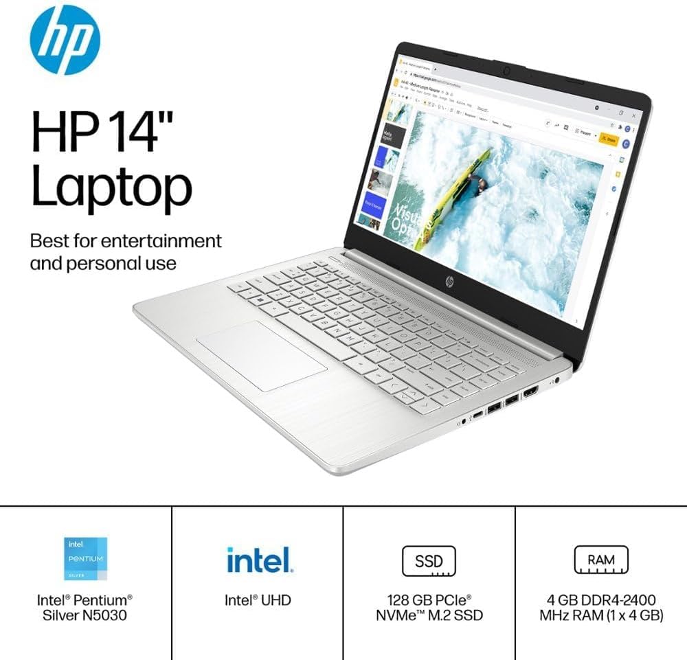 Do More From Anywhere. All-Day Long. Designed To Keep You Productive And Entertained From Anywhere, The Hp 14 Inch Laptop Pc Combines Long Battery Life With A Thin And Portable, Micro-Edge Bezel Design.One Year Microsoft Office 365 Includedstatement:Original Seal Is Opened For Upgrade Only. If The Computer Has Modifications, Then The Manufacturer Box Is Opened For It To Be Tested And Inspected And To Install The Upgrades To Achieve The Specifications As Advertised.Brand:Hpoperating System:Windows 11 Procolor: Natural Silver Processorprocessor Brand:Intelprocessor:Intel Pentium Silver N5030Processor Core:Quad-Coreprocessor Model Number: N5030Model Number: 14-Dq0703Dxcpu Boost Clock Frequency: 3.1 Gigahertz Graphicsgraphics:Intel Uhd Graphicsgpu Brand:Intelgpu Type:Integrated Memory & Storagetype Of Memory (Ram):Ddr4Memory:8Gb/16Gb/32Gbstorage Type:Ssdhard Drive:256Gb/512Gb/1Tb/2Tbdisplaydisplay Type:Ledtouch Screen:Yesscreen Size:14 Inch Hdscreen Resolution:1366 X 768Brightness:220 Nits Connectivity:Wireless Networking:Wi-Fi 5Wireless Connectivity:Bluetoothports:1 X Usb-C 3.02 X Usb-A 3.01 X Hdmi1 X Sd Card Reader1X Headphone/Microphone Combination Jacktouch Screen: Falsenumeric Keypad: Falsecamera: 720P Dimensions:12.76X 8.86X 0.71 Inches Weight:3.24 Pounds