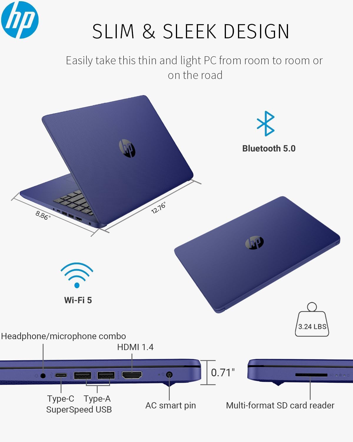 This Newest Hp 14'' Laptop: Designed For The Always Connected Life, The Nimble Hp Stream Laptop Lets You Easily Shift From Homework Workhorse To Streaming Your Favorite Shows.Processor: Intel Celeron N4120 Processorgraphics: Intel Uhd Graphicsoperating System: Windows 11 Home S Mode 64-Bitmemory: Upgraded To 16Gb Ddr4 Sdramhard Drive: Upgraded To 128Gb Storage (64Gb Emmc+64Gb Sd Card)Optical Drive: Nodisplay: 14.0-Inch Diagonal, Hd (1366 X 768), Micro-Edge, Brightview, 220 Nits, 45% Ntsctouchscreen: Noconnectivity: Realtek 802.11B/G/N/Ac (2X2) And Bluetooth Comboaudio: Dual Speakerskeyboard: Us English, Non-Backlitbuilt-In Hd Webcam: Hp True Vision 720P Hd Camera With Integrated Dual Array Digital Microphonesmedia Drive: Multi-Format Sd Media Card Readerports:1 Superspeed Usb Type-C 5Gbps Signaling Rate2 Superspeed Usb Type-A 5Gbps Signaling Rate1 X Ac Smart Pin1 X Hdmi 1.4B1 X Headphone-Out/Microphone-In Combo Jackbattery Life:Up To 11.5 Hours (Video Playback)3-Cell, 41 Wh Lithium-Ion Prismatic Batterycolor: Indigo Bluedimensions L X W X H (Inches): 12.76 X 8.86 X 0.71Weight: 3.24 Lbsaccessories: Ratea Value Bundle: 64Gb Micro Sd Card, 4-In-1 Usb 3.0 Hub
