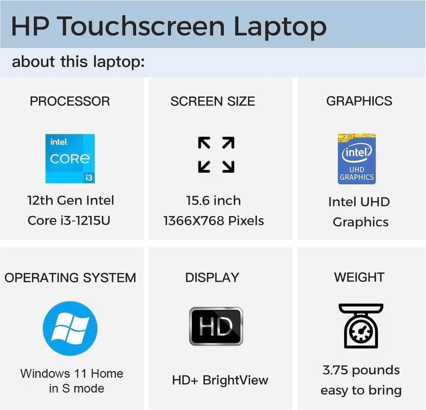 This Newest Hp 15'' Touchscreen Laptop Pc Is Thoughtfully Designed For Business And Education Purposes. Experience Reliable Performance With An Intel I3 Processor, Fast Wi-Fi, And Plenty Of Storage. This Laptop Has Got Your Back With A 15.6'' Touchscreen With Narrow Bezels, Enlarged Click Pad, And A Lift-Hinge Design. Processor: Intel Core I3-1215U, 2 P-Cores, 4 E-Cores, Total 8 Threads, Up To 4.4Ghz, 10Mb Cache Graphics: Intel Uhd Graphics Operating System: Windows 11 Home 64-Bit Memory: Upgraded To 16Gb Ddr4 3200Mhz Sdram Storage: Upgraded To 512Gb Internal Pcie Ssd + 500Gb External Portable Ssd Optical Drive: No Display: 15.6-Inch Diagonal, Hd (1366 X 768), Touchscreen, Micro-Edge, Brightview Touchscreen: Yes Connectivity: Realtek Rtl8822Ce 802.11A/B/G/N/Ac (2X2) Wi-Fi And Bluetooth 5 Audio: Dual Speakers Keyboard: Us English, Non-Backlit Built-In Hd Webcam: Hp True Vision 720P Hd Camera With Temporal Noise Reduction And Integrated Dual Array Digital Microphones Media Drive: Yes Ports: 1 Superspeed Usb Type-C 5Gbps Signaling Rate 2 Superspeed Usb Type-A 5Gbps Signaling Rate 1 X Multi-Format Sd Media Card Reader 1 X Ac Smart Pin 1 X Hdmi 1.4B 1 X Headphone-Out/Microphone-In Combo Jack Battery Life: Up To 6 Hours Go From 0 To 50% Charge In Approximately 45 Minutes Color: Natural Silver Dimensions L X W X H (Inches): 14.1 X 9.53 X 0.71 Inches Weight: 3.75 Lbs Accessories: 500Gb Portable Ssd With 410Mb/S Data Transfer Rate