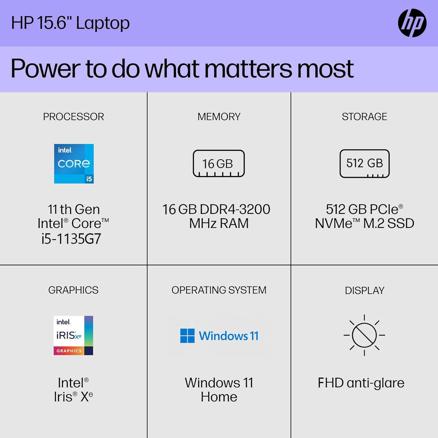 Powered Up And Productive. All Day Longwith A Long Battery Life And Fast-Charge Technology, This Laptop Lets You Work, Watch, And Stay Connected All Day. Integrated Precision Touchpad With Multi-Touch Support Speeds Up Both Navigation And Productivity.Take It Anywhere. See Morewith A Thin And Light Design, Take This Pc Anywhere. Do More With A Micro-Edge Display And Enjoy Vivid And Flicker-Free Images.Technical Specificationsprocessor: Intel Core I5-1135G7 With Xe Graphics (4 Cores 8 Threads, Base Clock Speed 2.4Ghz, Max Turbo To 4.2Ghz, 8Mb L3 Cache)Display: 15.6'' Fhd (1920 X 1080) Ips 250Nits, Micro-Edge,&Nbsp;Anti-Glare,&Nbsp;Brightview, 45% Ntsc Displaygraphics: Integrated Intel Iris Xe Graphicsmemory: 16Gb Ddr4 Memorystorage: 512Gb Pcie Nvme M.2 Ssdnetworking: Intel Wi-Fi 5 802.11Ac 2X2 + Bluetooth&Nbsp;Operating System: Windows 11 Home 64-Bitbattery: 3-Cell, 41 Wh Li-Ion Battery, Up To 10 Hours And 45 Minutescamera: Hp True Vision 720P Hd Camera With Integrated Dual Array Digital Microphones&Nbsp;Keyboard: Full-Size, Natural Silver Keyboard With Numeric Keypaddimensions: 14.11 X 9.53 X 0.71 Inchesweight: 3.75 Lbsi/O Ports2 X Usb-A 3.2 Gen 1 (1 Always On)Usb Type-C&Nbsp;Hdmi 1.4Bac Smart Pin&Nbsp;Headphone / Microphone Combo Jacksd Media Card Reader