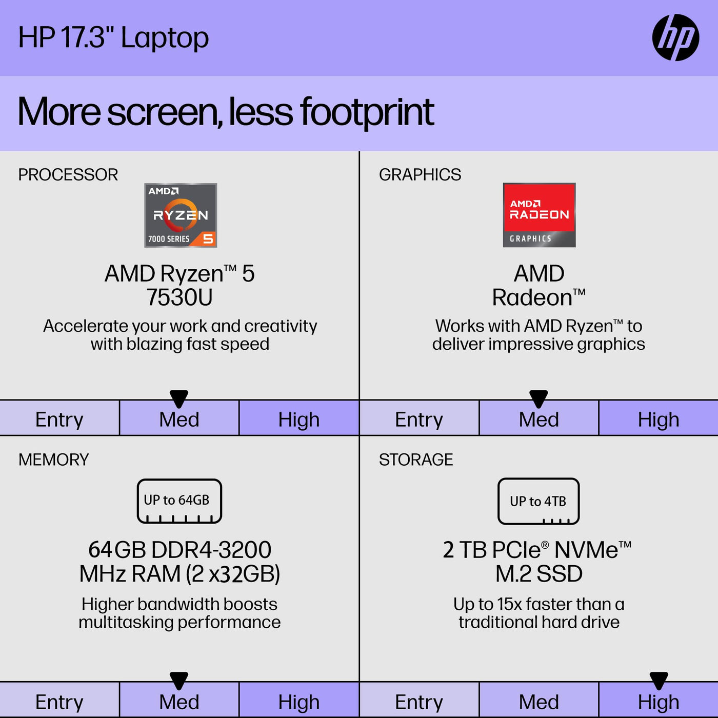 Statement:Original Seal Is Opened For Upgrade Only. If The Computer Has Modifications, Then The Manufacturer Box Is Opened For It To Be Tested And Inspected And To Install The Upgrades To Achieve The Specifications As Advertised.What'S In The Box1X Laptop (If Not Pre-Installed Windows 11 Pro And Office Lifetime, Please Request An Upgrade Key From The Customer Service Center)1X Mouse1X Laptop Standbrand: Hpoperating System: Windows 11 Proprocessorprocessor Brand:Amdprocessor:Amd Ryzen 5 7530Uprocessor Core: 6-Core Graphicsgraphics: Amd Radeon Graphicsgpu Brand: Amdgpu Type: Integrated Memory & Storagetype Of Memory (Ram): Ddr4Memory: 16Gb?32Gb?64Gbstorage Type: Ssdhard Drive: 1Tb?2Tbdisplaydisplay Type:Ledtouch Screen:Yesscreen Size:17.3 Inchesscreen Resolution:1600 X 900 (Hd+)Brightness:250 Nits Connectivity:Wireless Networking: Wi-Fi 6 (Wireless-Ax)Wireless Connectivity: Bluetooth 5.3Ports:1X Usb Type C2X Usb Type A1X Hdmi1X Headphone/Microphone Combination Jack Specificities:Numeric Keypad:Yesmedia Card Reader:Nosecurity Features:Privacy Camera Dimensions: 15.78'' X 10.15'' X 0.78''Weight: 4.82 Pounds