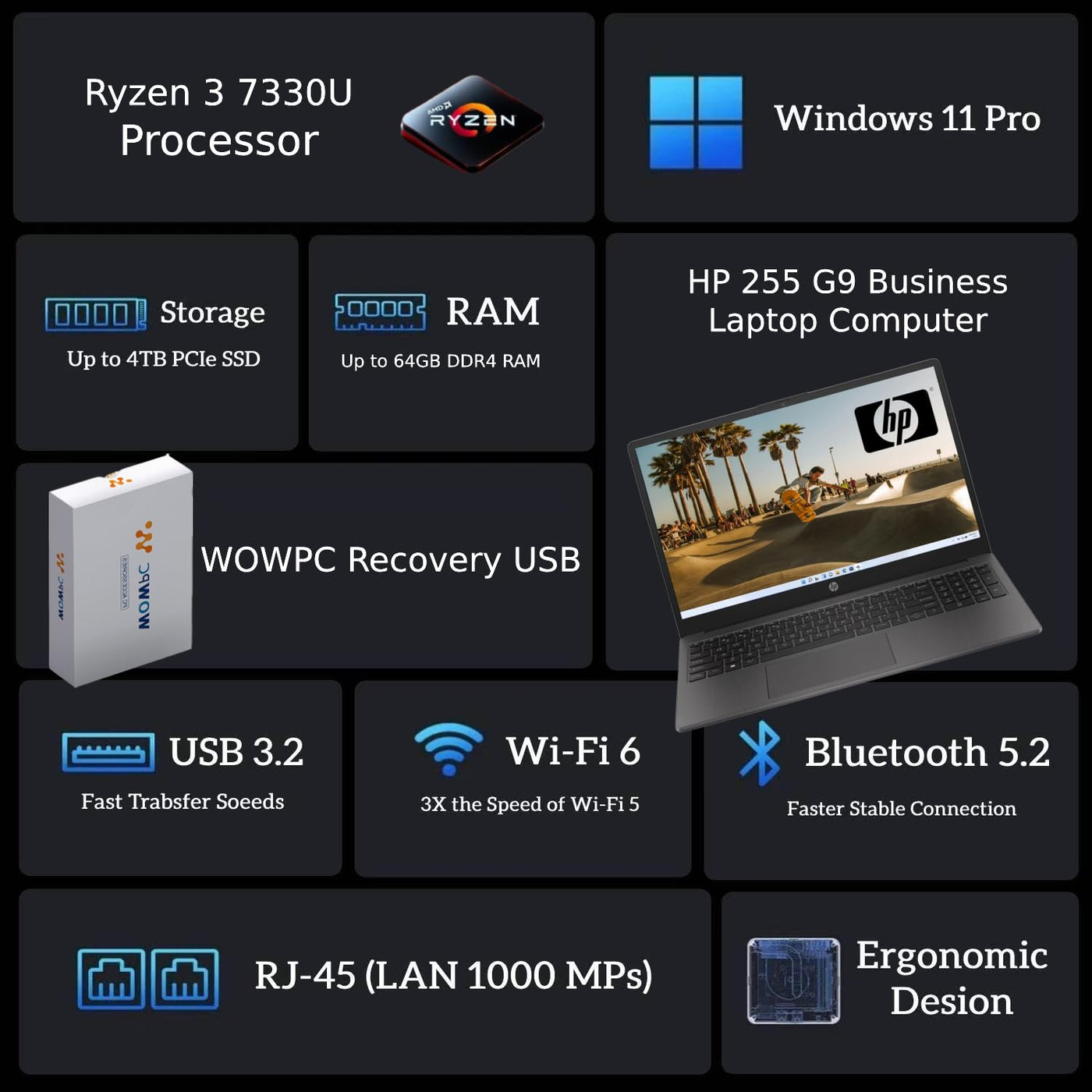 Accessory: Wowpc Recovery Usb Operating System: Windows 11 Pro 64 Bit Processor: Intel Core I3-1315U (Processor) Number Of Physical Cores: 6 Core, 8 Thread (Processor) Base Speed 3.3 Ghz (Processor) Turbo Speed: Up To 4.5 Ghz (Processor) Cache: 10Mb Ram: Up To 64Gb Storage: Up To 2Tb (Pcie-Nvme) Graphics: Integrated: Intel Graphics Display: 15.6'' Diagonal, Fhd (1920 X 1080), Ips, Narrow Bezel, Anti-Glare, 250 Nits Wireless: Wi-Fi, Bluetooth Optical Drive: Dvd?W Ports:1X Superspeed Usb-C 10Gbps, 2X Superspeed Usb-A 10Gbps, 1X Headphone/Microphone Combo, 1X Hdmi 1.4 Output, 1X Rj-45, 1X Audio-Out Audio: Dual Stereo Speakers, Dual Array Microphones Keyboard: Full-Size Keyboard With Numeric Keypad, Us English Dimensions L X W X H (Inches): 14.09 X 9.53 X 0.78 Inches Built-In Hd Webcam: Hd 720P Weight: 4 Lb