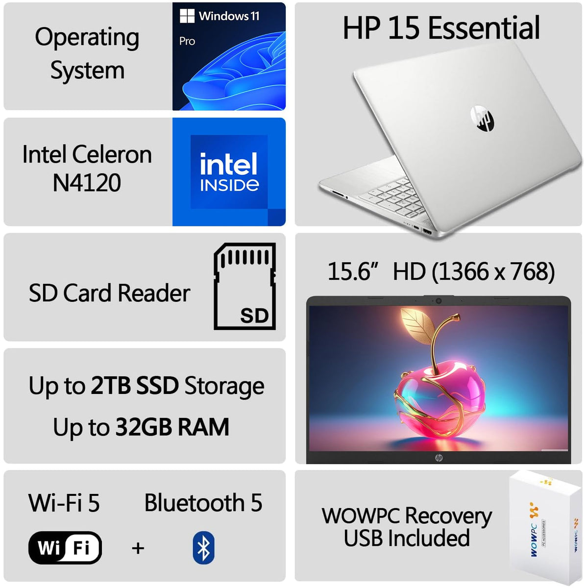 Accessory: Wowpc Recovery Usb Processor: Intel Celeron N4120 (Up To 2.6 Ghz, 4 Cores, 4 Threads) Graphics: Intel Uhd Graphics Operating System: Windows 11 Pro 64-Bit Memory: Up To 32Gb Ddr4 Ram Hard Drive: Up To 2Tb Pcie Nvme M.2 Ssd Display: 15.6'' Diagonal, Hd (1366 X 768), Micro-Edge, Anti-Glare, 220 Nits, 45% Ntsc Connectivity: Wifi, Bluetooth 5 Ports: 1 X Usb Type-C 5Gbps Signaling Rate (Supports Data Transfer Only And Does Not Support Charging Or External Monitors) 2 X Usb Type-A 5Gbps Signaling Rate 1 X Multi-Format Sd Media Card Reader 1 X Hdmi 1.4B 1 X Headphone / Microphone Combo Jack 1 X Power Connector Audio: Dual Speakers Keyboard: Full Size Keyboard, With Numeric Keypad, Us English Built-In Hd Webcam: Hp True Vision 720P Hd Camera With Integrated Dual Array Digital Microphones Color: Silver Dimensions L X W X H (Inches): 14.11 X 9.5 X 0.7 Weight: Starting At 3 Lbs