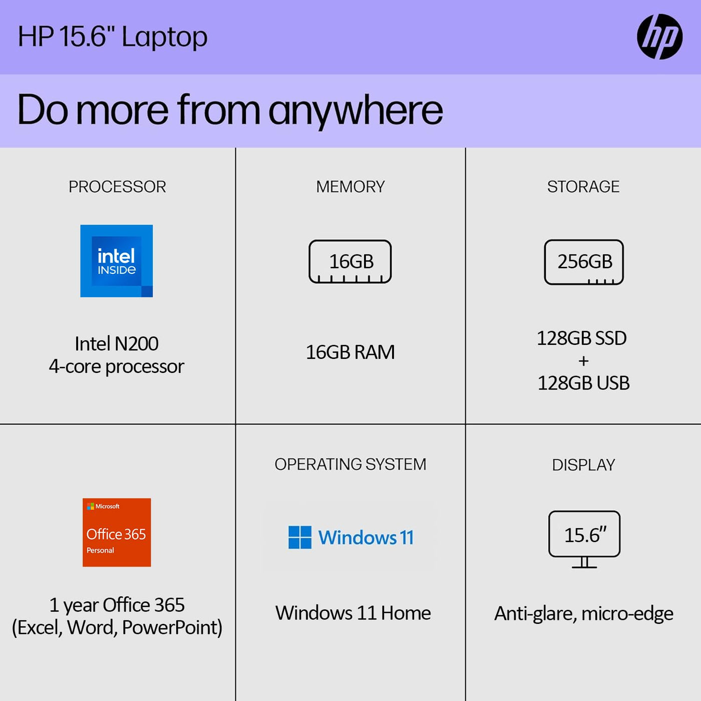 Accessory:&Nbsp; 1 Year Office 365 Personal (Get Full Access To Microsoft Excel, Word, Powerpoint, Onenote And 1 Tb Of One Drive Storage For 1 Year) Processor: Intel N200 (Up To 3.7Ghz, 4 Cores, 4 Threads) Graphics:&Nbsp;Intel&Nbsp;Uhd Graphics Operating System:&Nbsp;Windows 11 Home In S Mode 64-Bit Memory:&Nbsp;16Gb Ddr4 Sdram Hard Drive:&Nbsp;256Gb (128Gb&Nbsp;Ssd + 128Gb Usb) Display: 15.6'' Diagonal, Hd (1366 X 768), Micro-Edge&Nbsp; Ports:&Nbsp; 1 X Usb Type-C 2 X&Nbsp;Usb 3.0 1 X Power Connector 1 X Hdmi 1.4B 1 X Headphone / Microphone Combo Jack (3.5Mm)&Nbsp; &Nbsp; Connectivity: Wi-Fi 6 (11Ax, 2X2) And Bluetooth 5.3 Audio:&Nbsp;Dual Speakers Keyboard: Standard Full Size Keyboard With Numeric Keypad, Us English Built-In Hd Webcam:&Nbsp;True Vision 720P Hd Camera With Temporal Noise Reduction And Integrated Dual Array Digital Microphones Color:&Nbsp;Red Dimensions L X W X H (Inches): 14.17 X 9.29 X 0.73 In Inches Weight:&Nbsp;3.52 Lbs