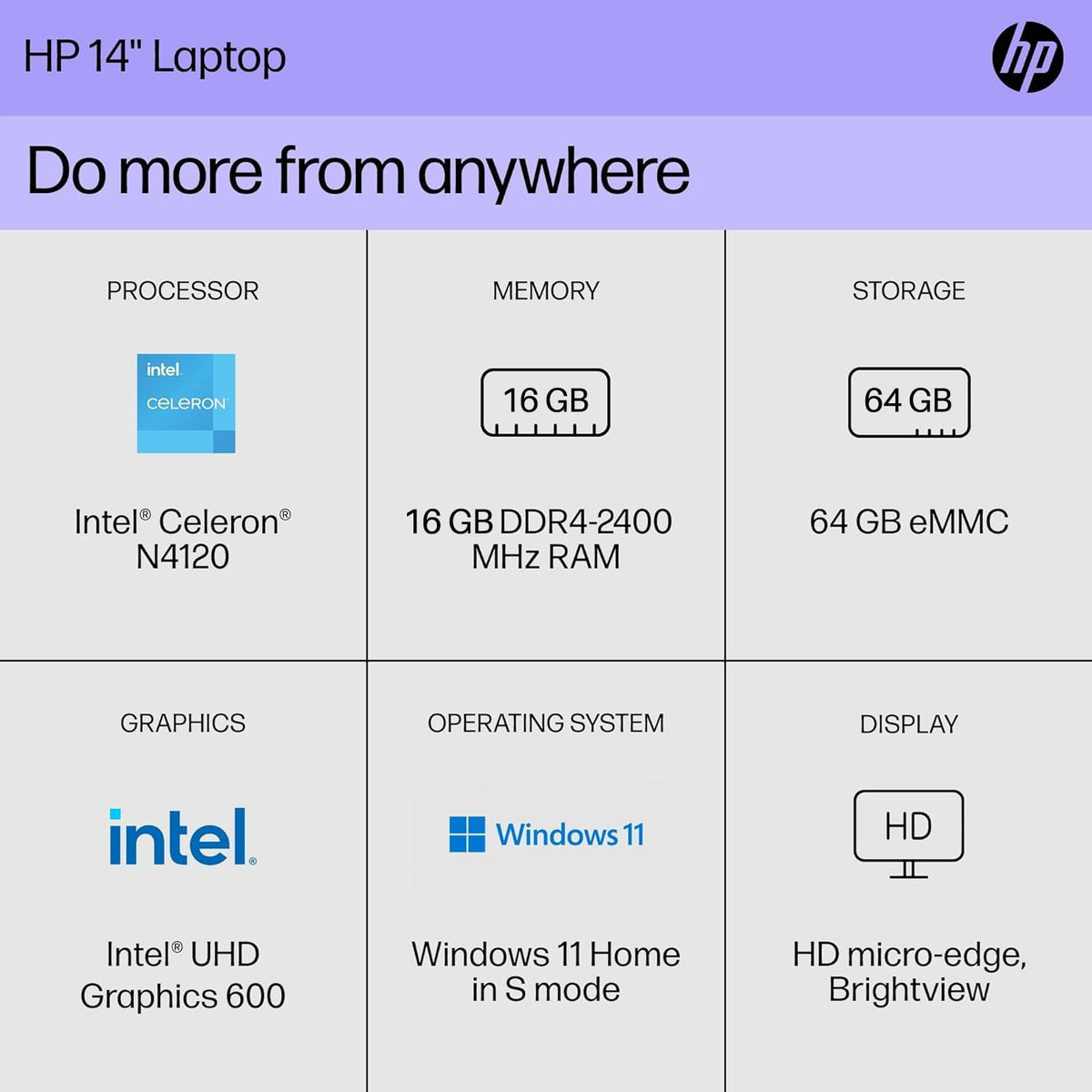 Hp Stream 14 Laptop - Intel Celeron 4120Operating System: Windows 11 Home In S Modedisplay: 14.0-Inch Diagonal, Hd (1366 X 768), Micro-Edge, Brightviewprocessor: Intel Celeron N4120, 4 Cores, 4 Threadsmemory: Up To 16Gb Ramstorage: 64Gb Emmcgraphics: Intel Uhd Graphics 600Battery Life: Up To 11 Hours And 30 Minutes (Video Playback); Up To 9 Hours (Wireless Streaming)Wireless: 802.11A/B/G/N/Ac (2X2)(19A) Wi-Fi And Bluetooth Combocamera: Hp True Vision 720P Hd Camerahp Fast Charge: Go From 0 To 50% Charge In Approximately 45 Minutes.Dimensions: 12.76 X 8.86 X 0.71 Inchesweight: 3.24 Lbsmanufacturer'S Warranty: 1 Year