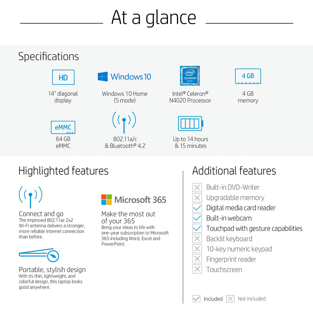 Designed for the always connected life, this nimble laptop lets you easily shift from homework workhorse to streaming your favorite shows. With its portable design, long battery life, and powerful Wi-Fi antenna, it delivers the essential productivity and features you want, without ever slowing you down.- With a thin, lightweight design and bold look, this laptop was never meant to stand still. It travels easily and comes in a vibrant, non-traditional color for a uniquely personal look.- Experience the most secure Windows ever built, streamlined for security and superb performance. Add in full access to Microsoft Excel, Word, PowerPoint, OneNote, Access, and 1 TB of OneDrive Storage for one year, for improved productivity.- The improved 802.11 ac 2x2 Wi-Fi antenna delivers a stronger, more reliable Internet connection than before and with over 10 hours of battery life, you'll enjoy enhanced streaming, fast downloads, and smooth web surfing all day.- Easily take this thin and light PC from room to room or on the road. When your PC goes wherever you go, staying productive and entertained has never been easier.