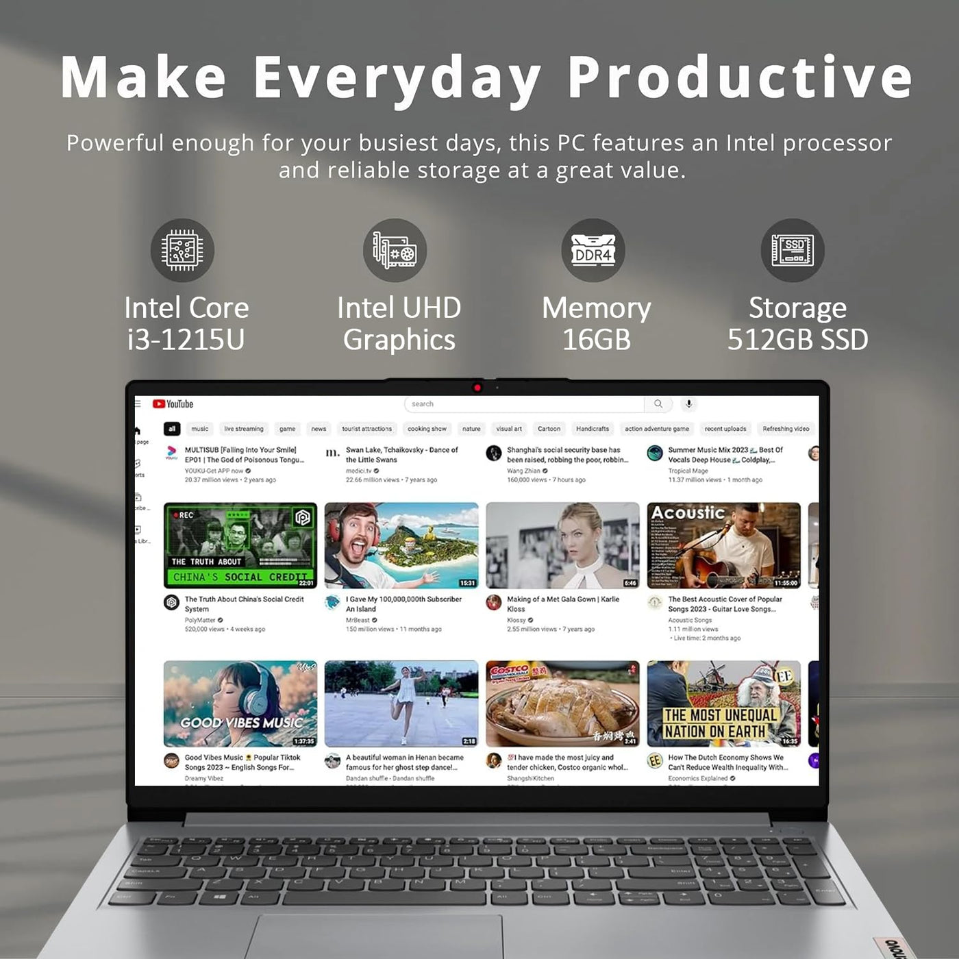 Processor: 12Th Gen Intel Core I3-1215U (6 Core, 8 Thread, Up To 4.4Ghz) Graphics: Intel Uhd Graphics Operating System: Windows 11 Home 64-Bit Memory: 16Gb Ddr4 Hard Drive: 512Gb Pcie Nvme M.2 Solid State Drive Optical Drive: No Display: 15.6'' Fhd (1920X1080) Tn 220Nits Anti-Glare Connectivity: Wifi 5 + Bluetooth 5.1 Audio: Stereo Speakers, 1.5W X2, Dolby Audio Keyboard: Us English, Full Size Keyboard With Numeric Keypad Built-In Hd Webcam: Hd 720P With Privacy Shutter Ports: 1 X Usb Type-C 3.2 Gen 1 (Support Data Transfer Only) 1 X Usb Type-A 3.2 Gen 1 1 X Usb Type-A 2.0 1 X Hdmi 1.4B 1 X Headphone / Microphone Combo Jack (3.5Mm) 1 X Sd Card Reader 1 X Power Connector Color: Grey Dimensions L X W X H (Inches): 14.18 X 9.29 X 0.70 Inches Weight: 3.59 Lbs