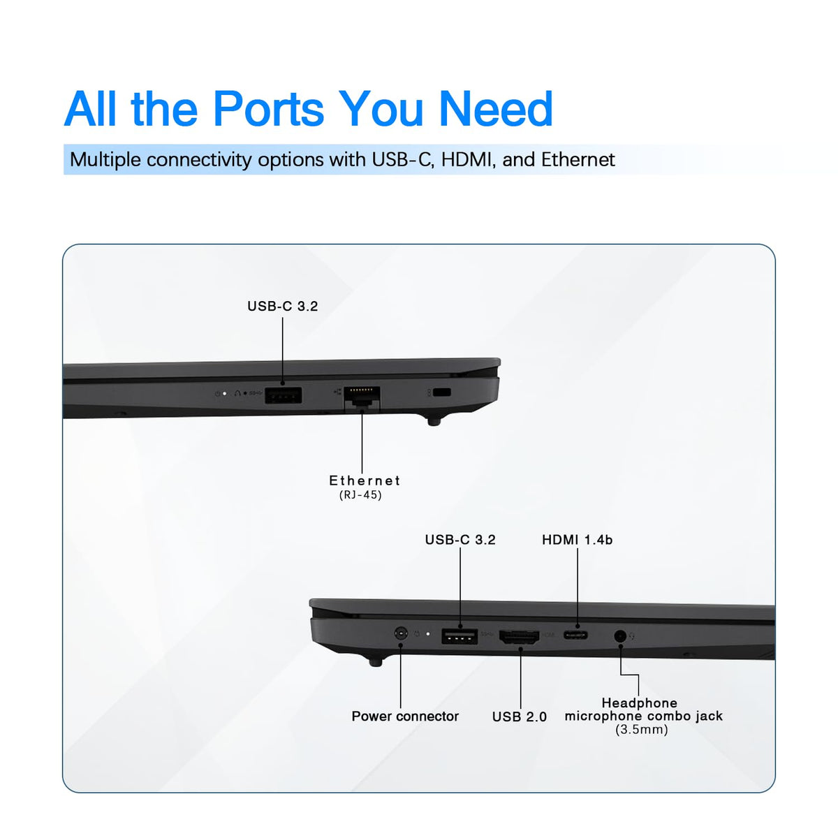 Processor: Intel Celeron N5100 (4C / 4T, 1.1 / 2.8Ghz, 4Mb L3) Graphics: Intel Uhd Graphics Operating System: Windows 11 Pro 64-Bit Memory: 32Gb Ddr4 Sdram Hard Drive: 2Tb Solid State Drive Optical Drive: No Display: 15.6'' Fhd (1920X1080) 250Nits Anti-Glare Connectivity: Wi-Fi 5, 802.11Ac 2X2 + Bt5.1 Audio: High Definition (Hd) Audio, Realtek Alc3287 Codec Spreakers: Stereo Speakers, 1.5W X 2, Dolby Audio Keyboard: Us English, Nonbacklit Full Size Keyboard Built-In Hd Webcam: Hd 720P With Privacy Shutter Ports: 1 X Usb 2.0 2 X Usb 3.2 Gen 1 1 X Ac Smart Pin 1 X Hdmi 1.4B 1 X Headphone / Mic Combo Jack 1 X Ethernet Port (Rj-45) Battery: Up To 11.5 Hours Color: Black Dimensions L X W X H (Inches): 14.14 X 9.28 X 0.78 Weight: 3.75 Lbs Accessories: 1 X 512Gb External Hard Drive 1 X Microfiber Cloth 1 X Hotkey Sticker