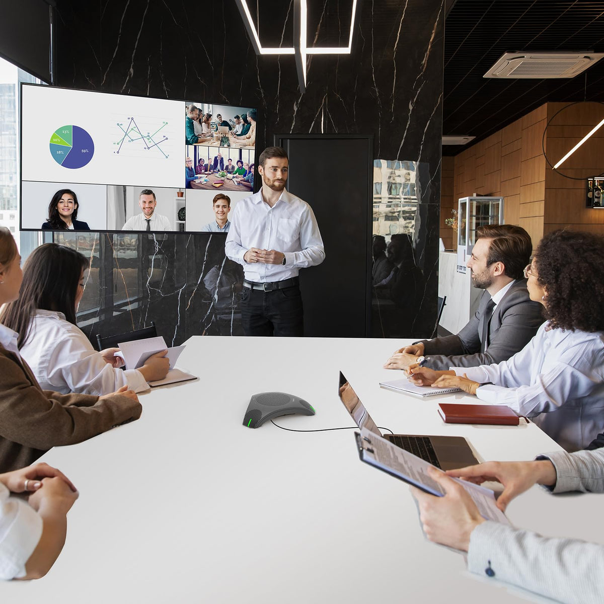 Q: What makes this USB speakerphone suitable for large meetings?A: The speakerphone features 360° voice pickup and smart audio algorithms that enhance sound clarity, making it ideal for larger meetings. Its design ensures that every participant can be heard clearly, even in noisy environments.