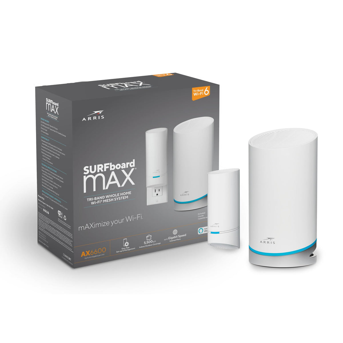 Q: How does the ARRIS Surfboard mAX improve Wi-Fi coverage?A: With coverage up to 5,500 sq ft, the ARRIS Surfboard mAX utilizes advanced mesh technology to eliminate dead zones and ensure consistent performance in every corner of your home.