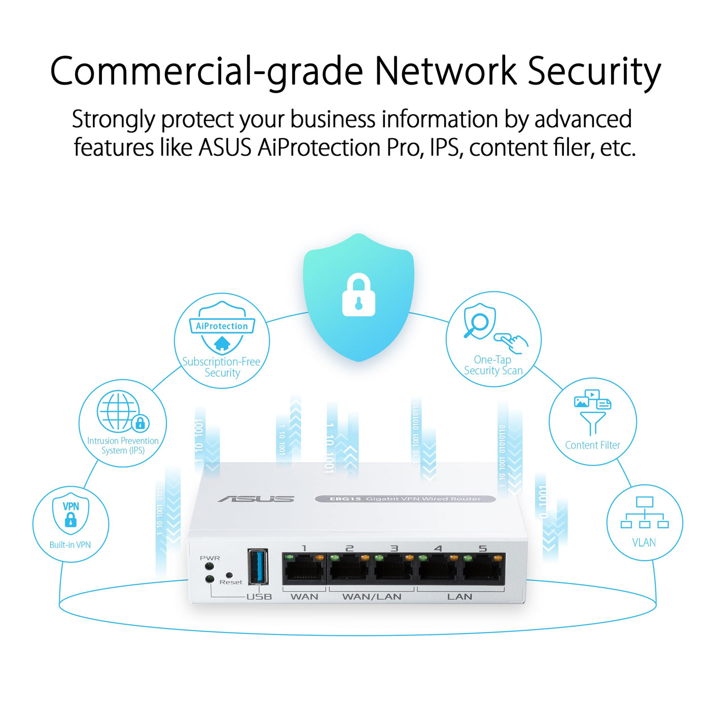 The Asus Expertwifi Ebg15 Provides A Fast, Secure And Scalable Network With Rich Features Tailored For Small-To-Midsized Businesses. It Provides Network Stability And Internet Backup With Two Wan/Lan Ports And One Usb Port. As Businesses Expand, Connect The Ebg15 To The Switch And Access Point For Broader Coverage. Disclaimer: Actual Data Throughput And Wifi Coverage Will Vary From Network Conditions And Environmental Factors, Including The Volume Of Network Traffic, Building Material And Construction, And Network Overhead, Result In Lower Actual Data Throughput And Wireless Coverage.