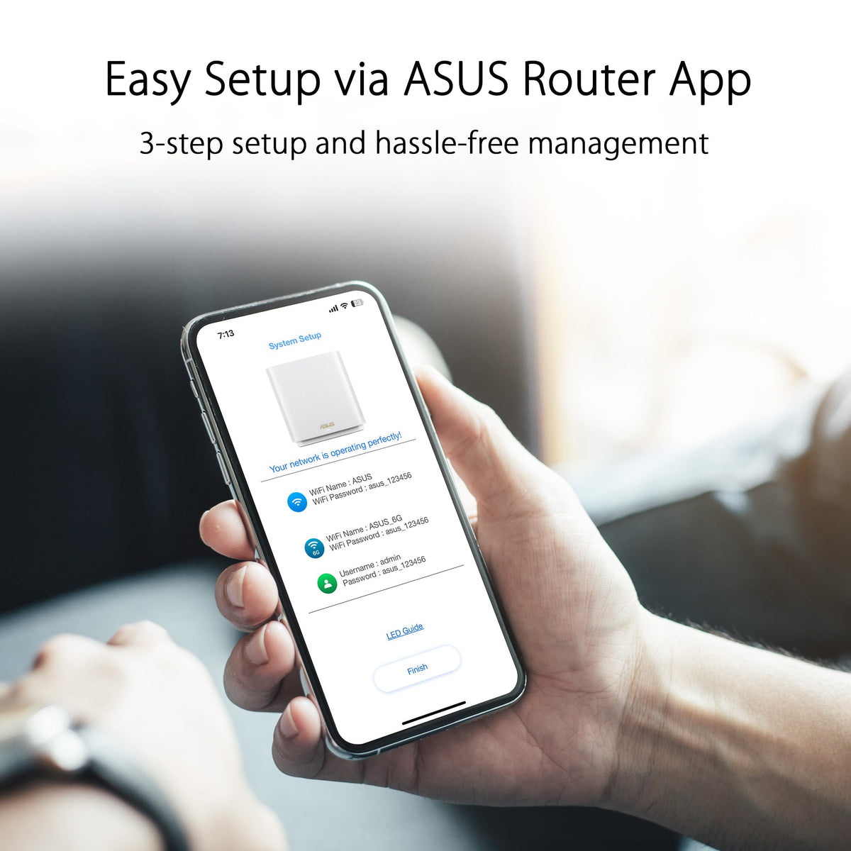 Q: How easy is it to set up the ASUS ZenWiFi system?A: Setting up the ASUS ZenWiFi system is straightforward and user-friendly, featuring an EasySetup process that allows you to have your network running in no time, even if you're not tech-savvy.