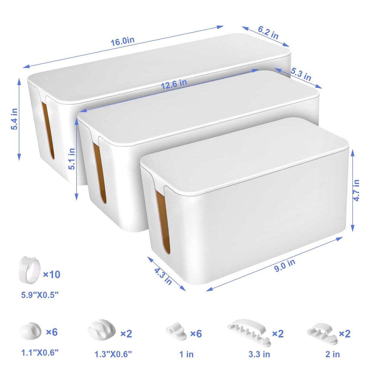 Tangled And Loose Cords Can Easily Cause Accidents And Damages. Cable Management Kit Offers You 3 Different Ways To Solve All Your Cord Chaos. This 3 Size Cable Management Box Can Help To Hide Your Power Strips, Adaptors And Excess Cord Length From Piling Up On Your Floors Or Cluttering Your Desk. The Lid Can Also As A Tray To Stash Smart Phones Or Other Small Devices.