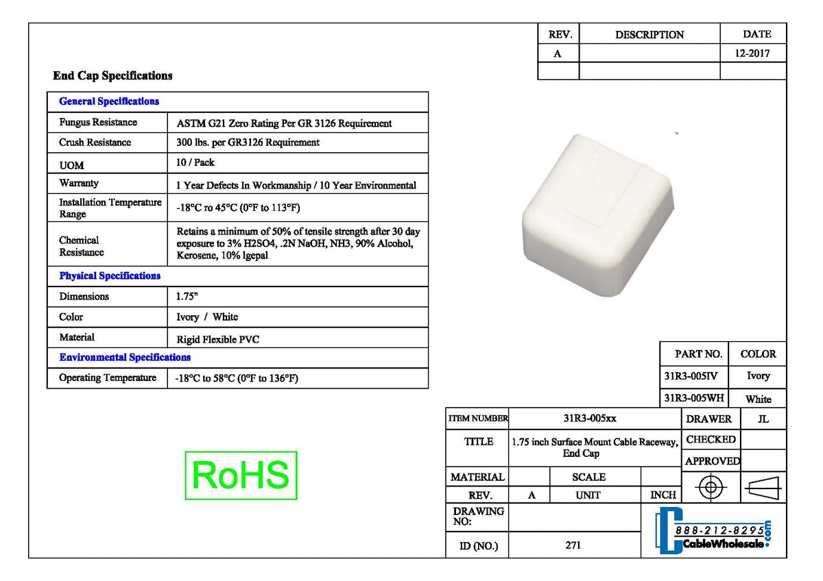 This White 1.75 Inch Raceway Piece Serves As An End Cap To Cap The End Of A Cable Raceway. This Covers Both Aesthetics, Protection And Cleanliness. It Will Prevent Ends From Being Hit And Possible Chipped Or Cracked And It Will Keep Unwanted Dust Bunnies (Junk) Out Of Your Runs. Use Surface Mount Cable Raceways To Protect And Tidy Up Cable Runs Around The Home Or Office Where Running Through Walls Is Not Possible Or Practical. These Raceways Are Useful For Nearly Any Type Of Cable From Phone, Network, Usb, Vga, Audio/Video, Speaker And More. Some Sample Applications Would Be: Office Cubicles Where Walls Are Not Available Or The Working Space Can Change Configuration Or In The Existing Home Where One Wants To Install Surround Speakers And Hide/Protect The Speaker Cables/Wires.