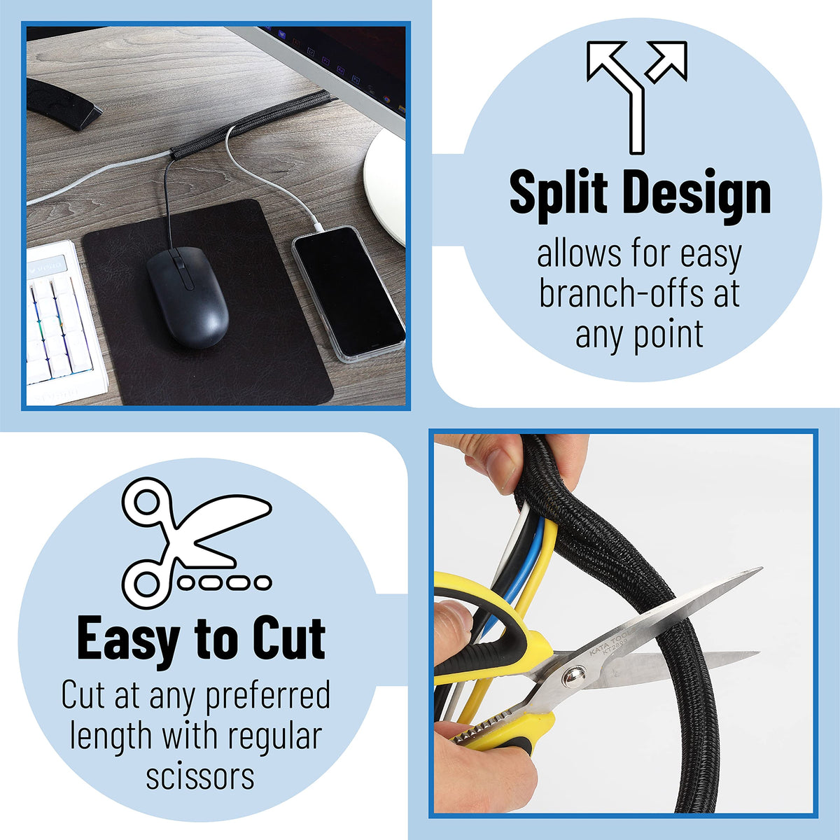 Q: Can the cable sleeve be cut to a desired length?A: Yes, the Bates cable sleeve can be easily cut with scissors to any length you need for your specific cable management project.
