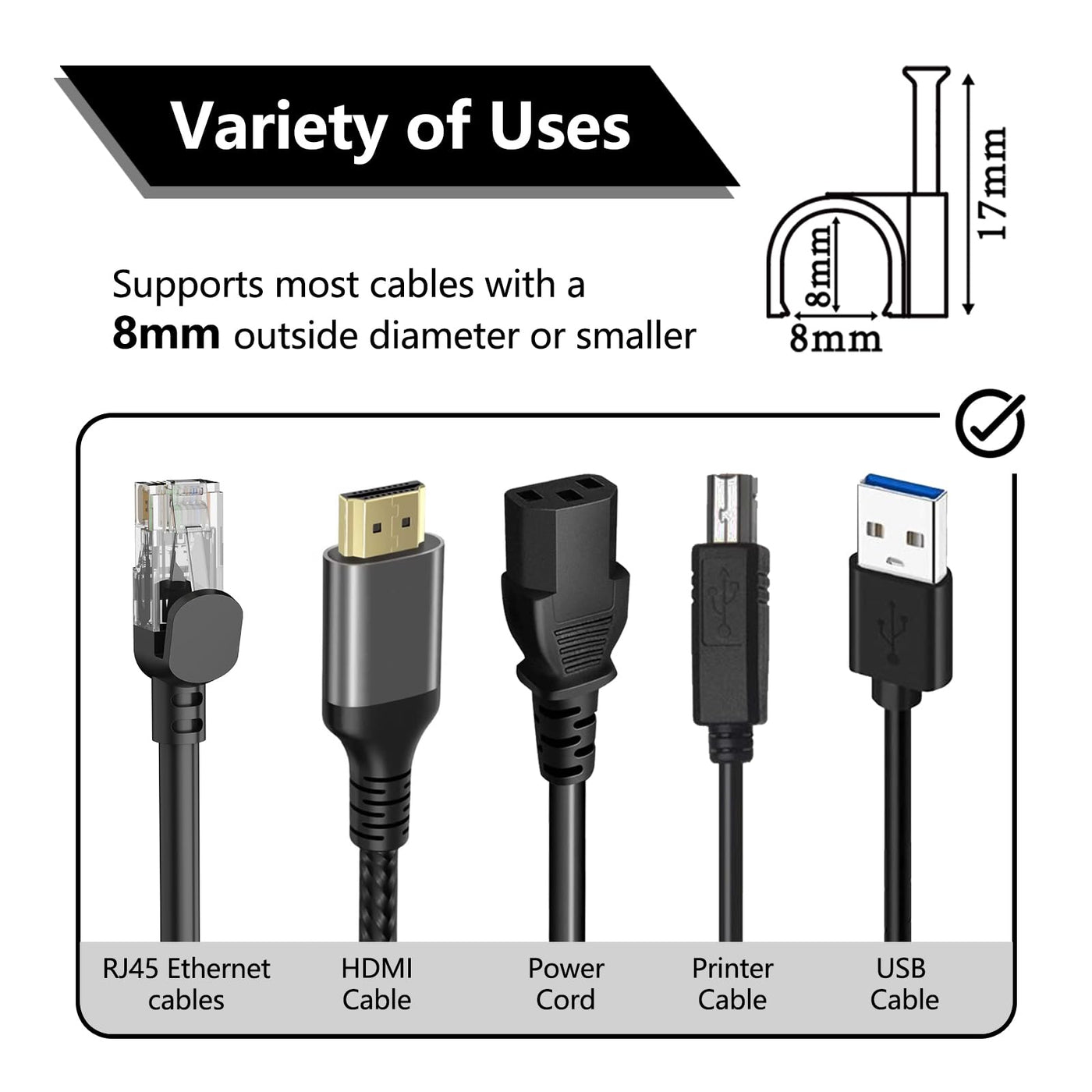 Q: What types of cables can Jadaol Cable Clips hold?A: Jadaol Cable Clips are suitable for various types of cables including RJ45 Ethernet cables, coax cables, USB cables, TV cables, and computer power cords. These clips are designed to handle different cord sizes effectively, making them ideal for both home and office cable management.