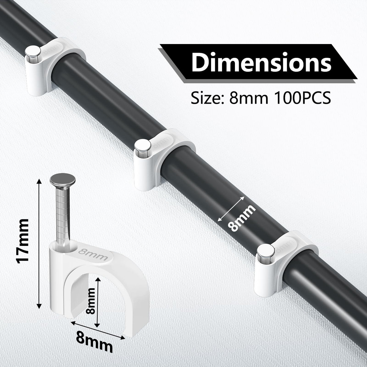 Product Features Summary:High Quality Materialmade From Premium Stabilized Plastic And Hardened Nails, Ensuring They Are Very Difficult To Break.Features Strong Bearing Capacity, Corrosion Resistance, Aging Resistance, And Excellent Insulation Performance.Sturdy Designunique One-Piece Pressing Design With Long Nails For Secure Fastening.Robust, Durable, And Slip-Resistant, Ensuring Clips Stay In Place And Do Not Loosen Over Time.Easily Organize Various Cables.Easy Installationsimple To Install: Just Position The Cable Nail Clips And Use A Hammer To Tap The Nail Into Walls, Wood, Plaster, Brick, Etc.Quickly Organize Messy Cables And Wires, Preventing Tripping Hazards And Keeping The Room Tidy.Variety Of Uses8Mm Round Cable Tacks Come In A Pack Of 100, Suitable For Home And Office Cable Management.Ideal For Rj45 Ethernet Cables, Satellite Dish Wires, Coax Cables, Usb Cables, Tv Cables, Computer Power Cords, And More.Best Choiceif You Encounter Any Issues, Please Contact Us, And We Will Provide A Satisfactory Solution Within 24 Hours.We Are Confident You Will Love Our Nail-In Cable Clips And The Organization They Bring To Your Space.