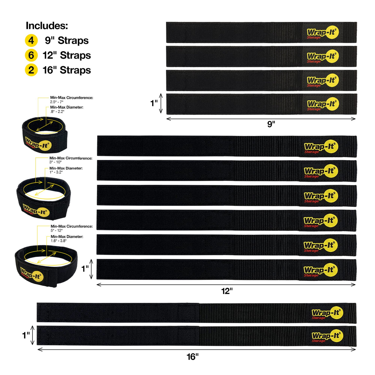 Quick Straps By Wrap It Storage Assorted 12 Pack (Black) Hook And Loop Hose And Cable Organizers