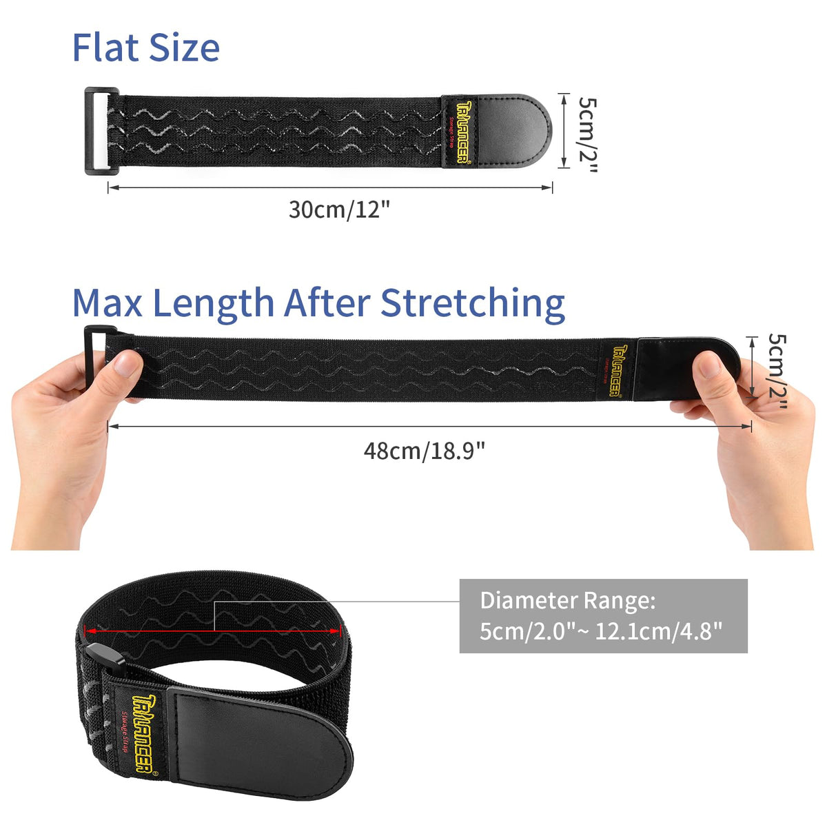 Q: What are the dimensions of the Trilancer Elastic Cinch Straps?A: The Trilancer Elastic Cinch Straps are 12 inches long and 2 inches wide, with the ability to stretch up to 19 inches for larger applications.