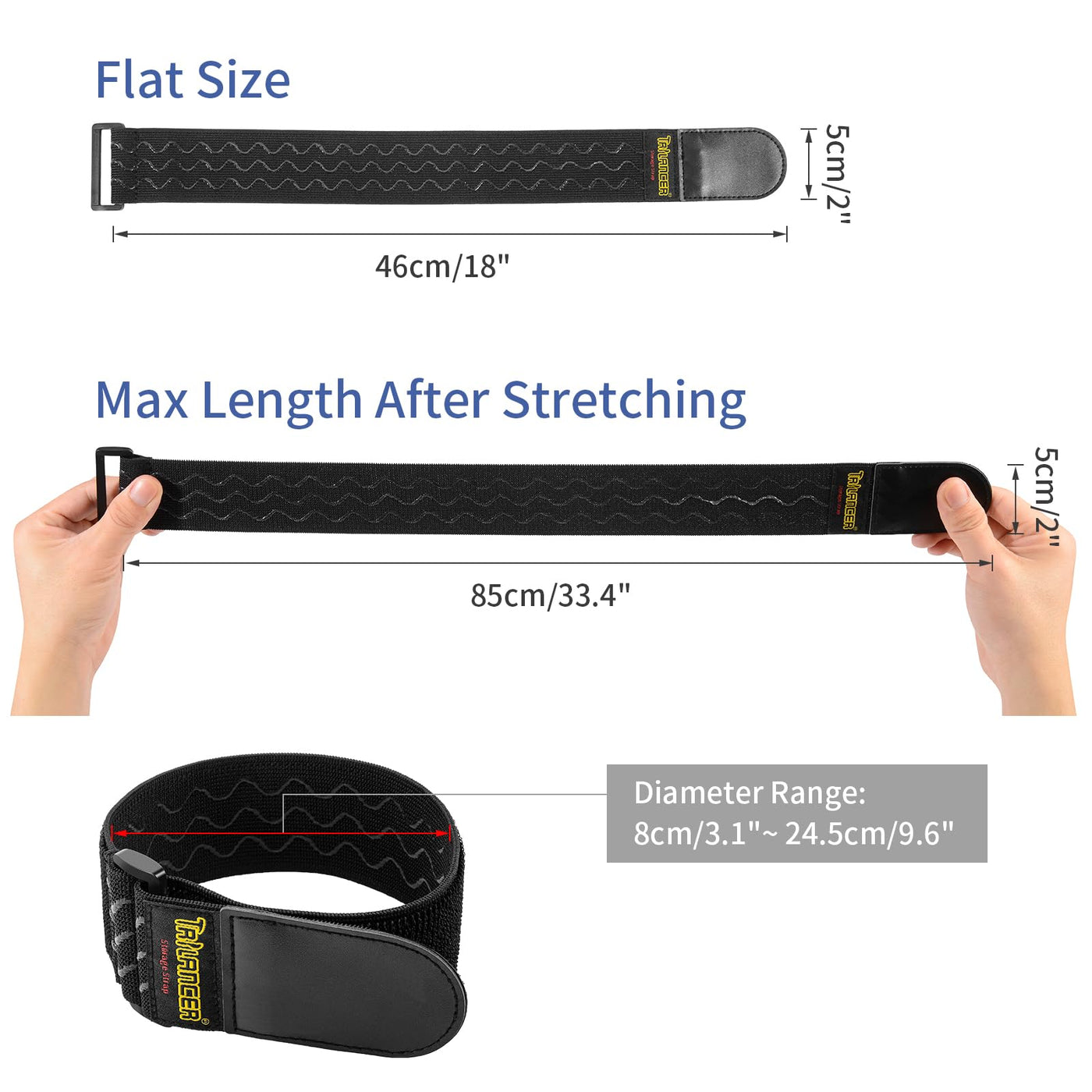 Q: What are the maximum and minimum lengths of the Trilancer Elastic Cinch Straps?A: The Trilancer Elastic Cinch Straps can stretch from their original length of 18 inches to a maximum length of 33.5 inches, making them versatile for various bundling needs.