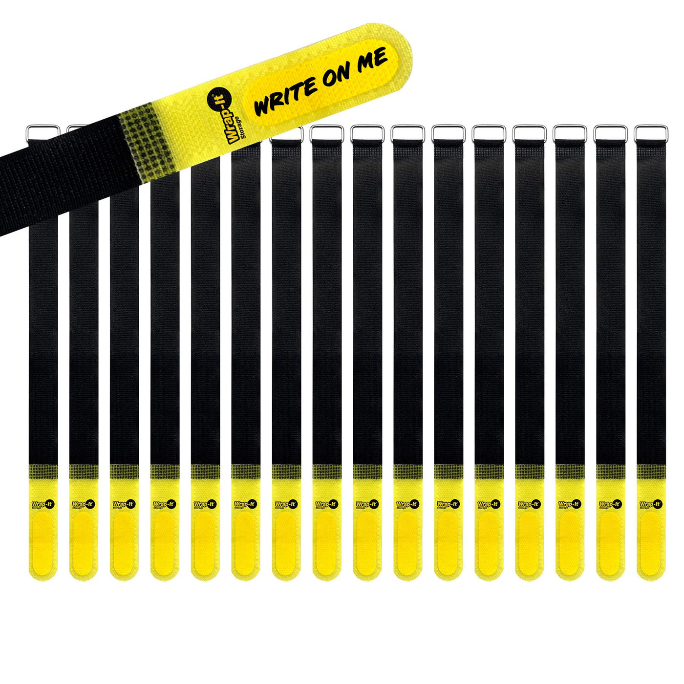 Wrap It Storage Hook And Loop Cinch Straps 12'' 16 Pack (Yellow/Black) With Write On Label For Easy Cord Identification And Cabl