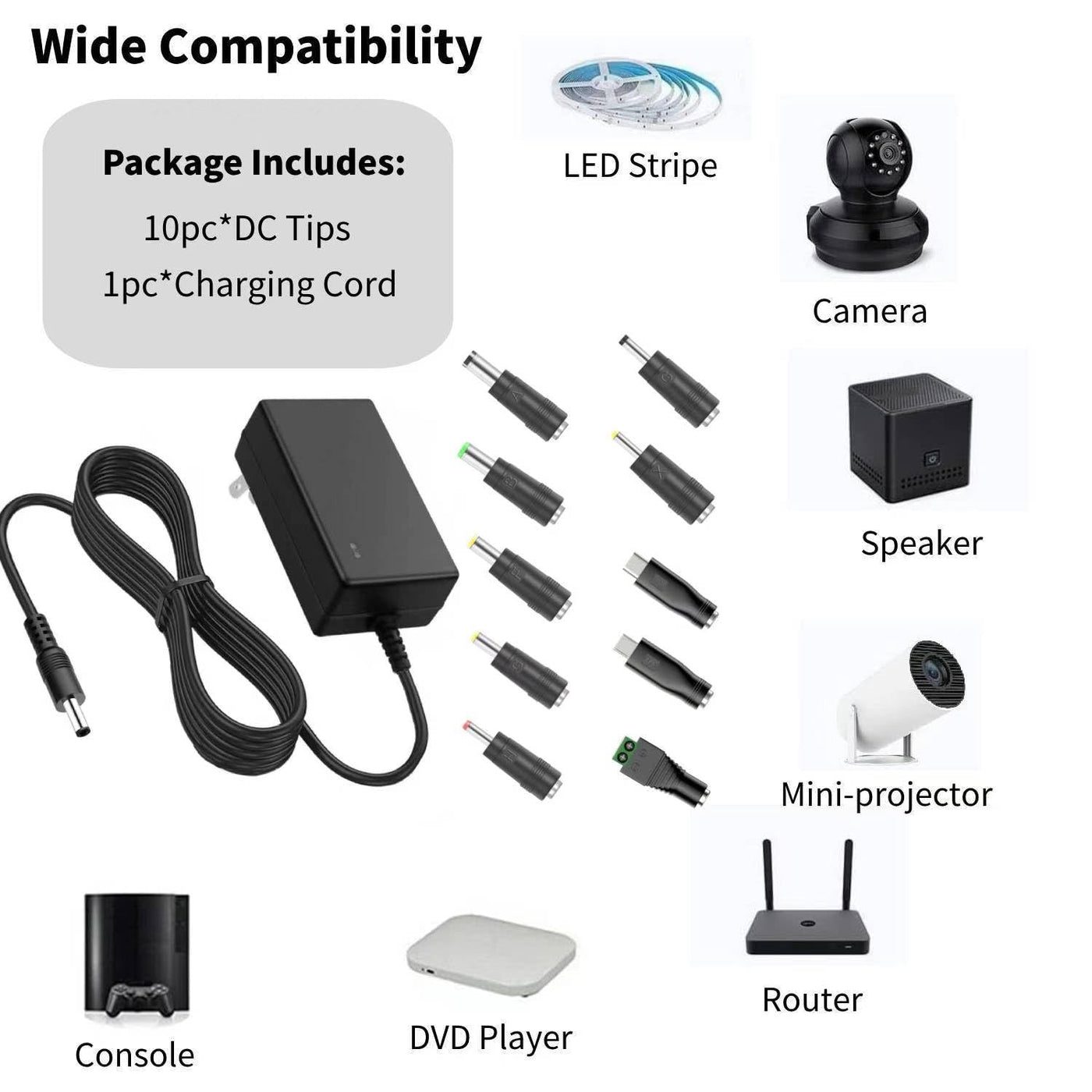 12V 2A Power Supply Ac Dc Adapter With 10 Tips, Universal Dc In 12 Volt 2 Amp Power Cord, Converter Transformer 100 240V, 50/60H